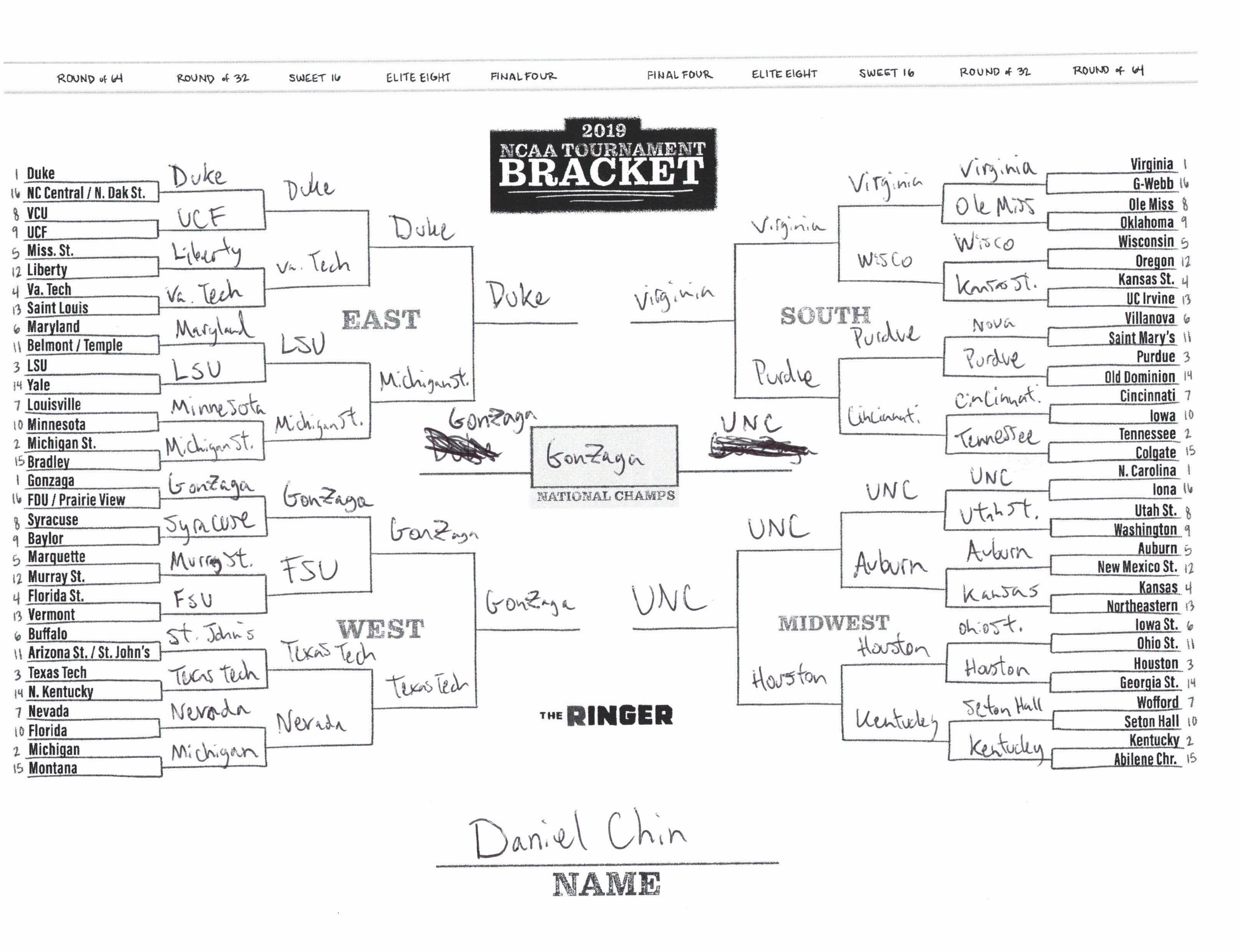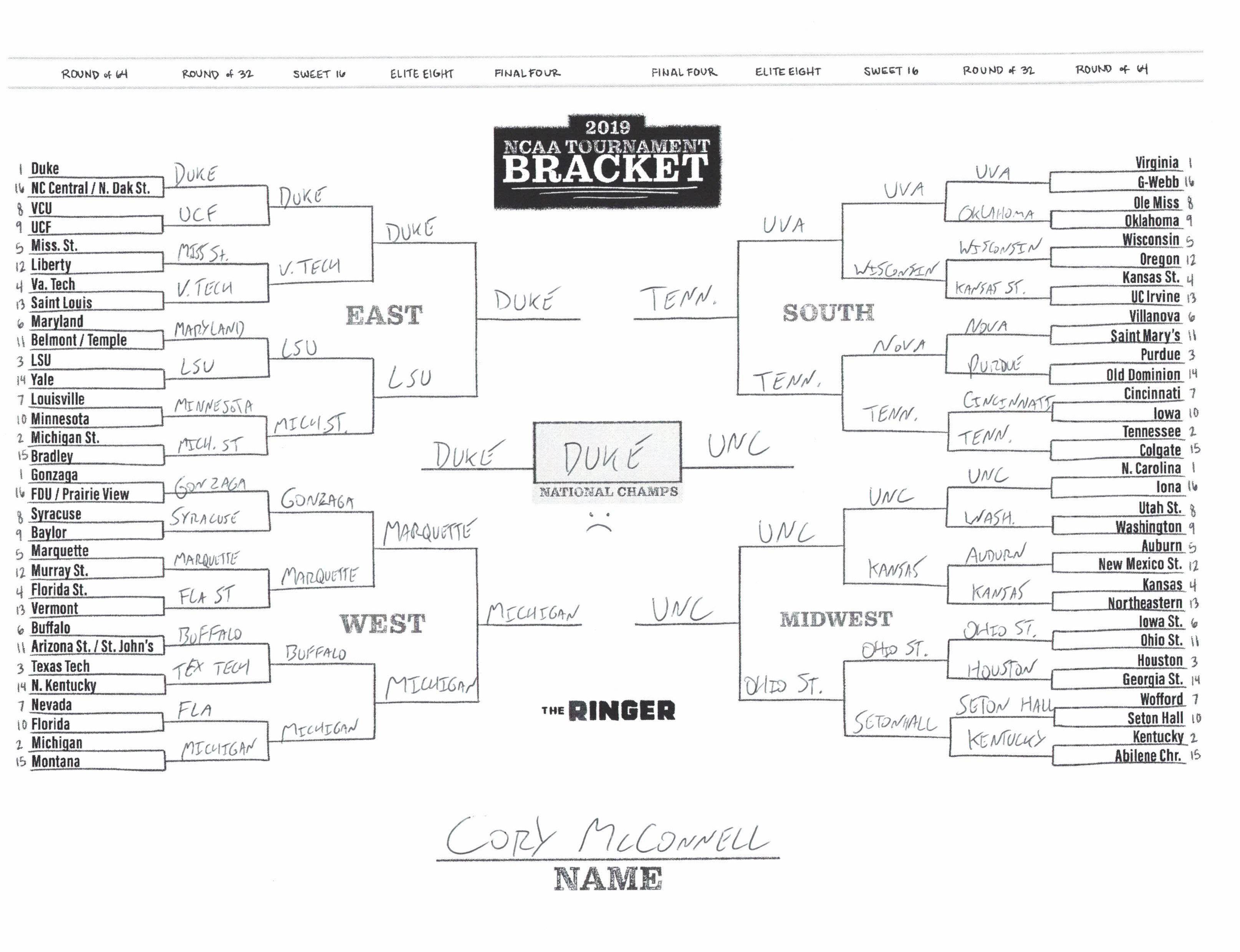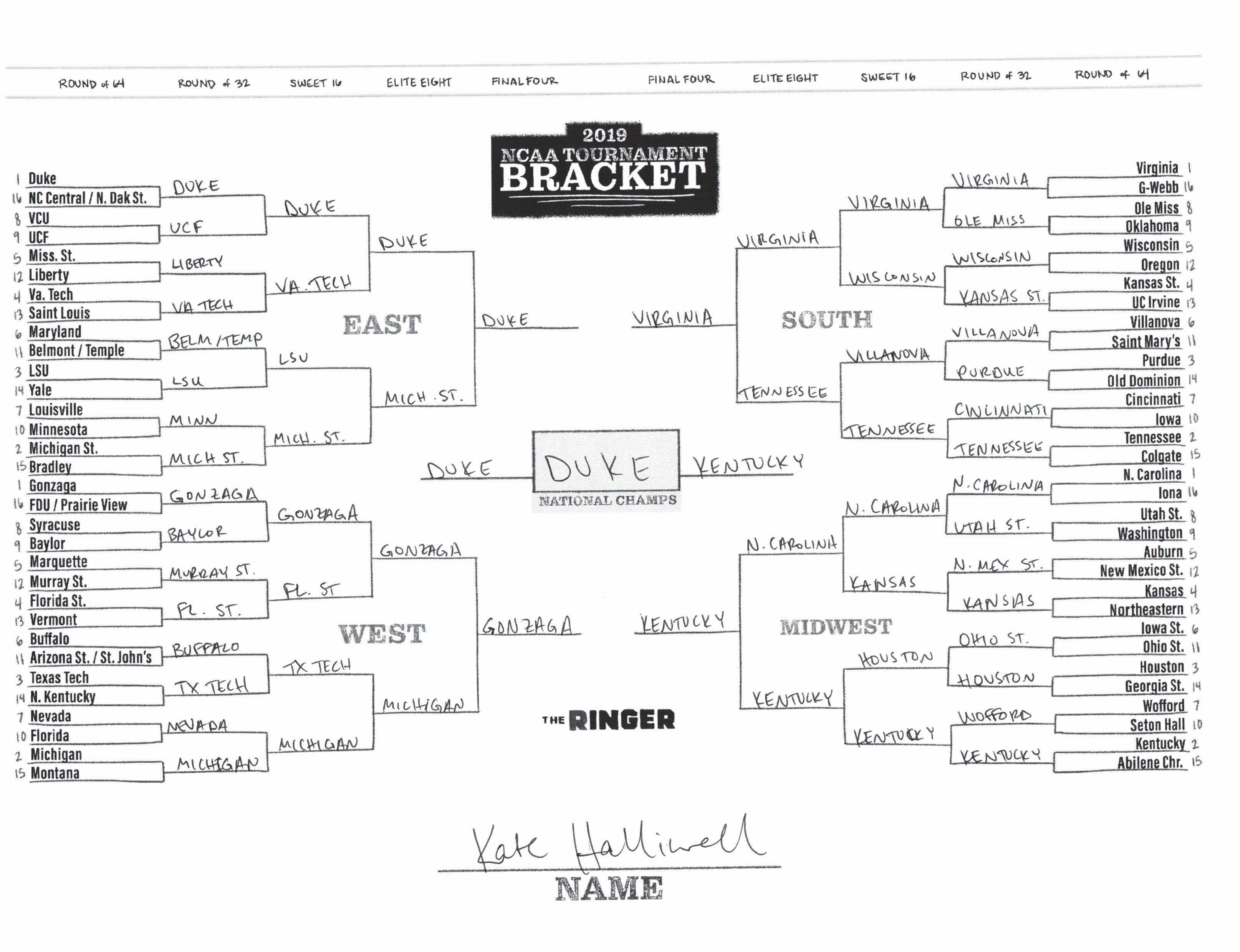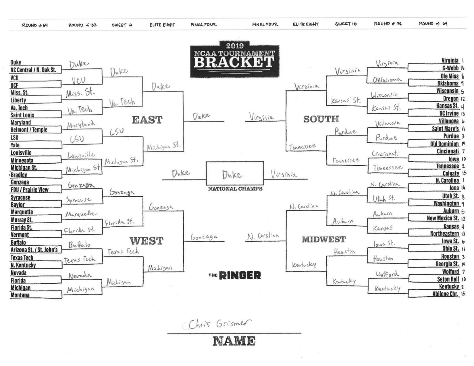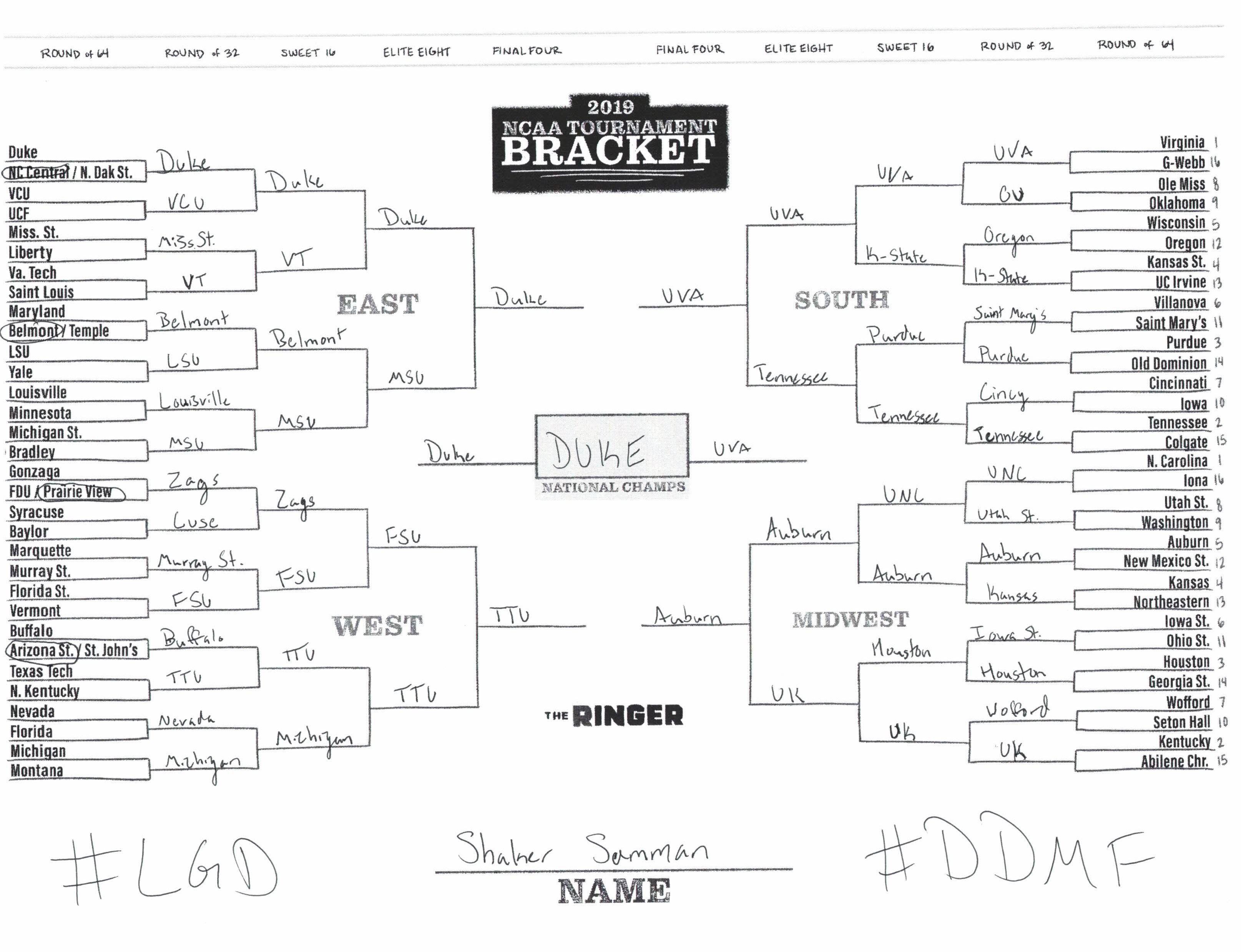 The 2019 NCAA tournament is here, and that means it’s time to talk about Zion, office pools, Zion, Cinderellas, and Zion. It also means that it’s time for Ringer staffers to publish their sure-to-be-accurate March Madness picks. Some of the brackets below were filled out by people who know the correct way to spell Mike Krzyzewski. Others were filled out by people who believe that Ja Morant was a contestant on The Masked Singer. All are guaranteed to be right.