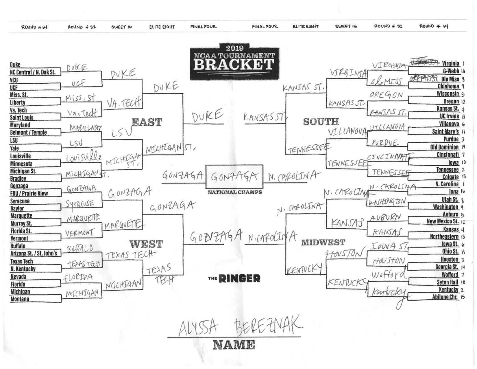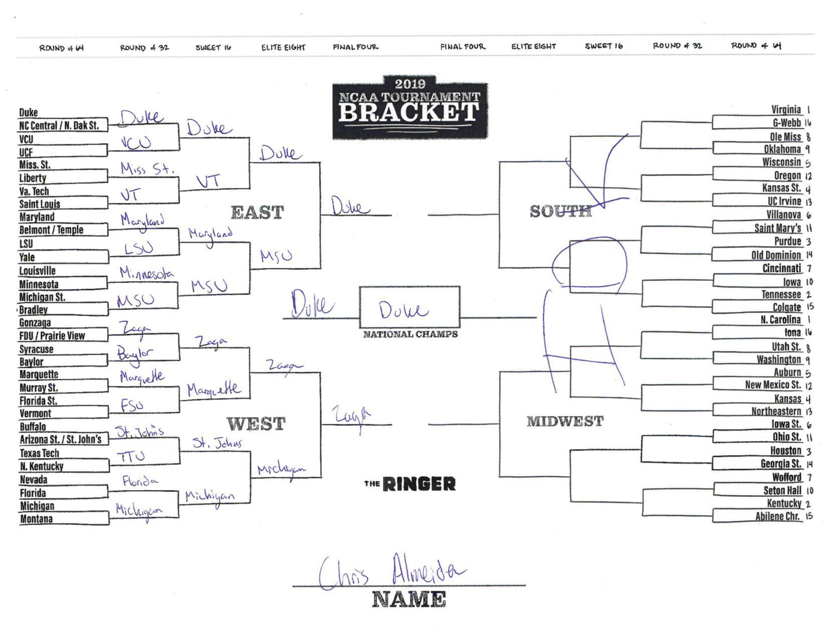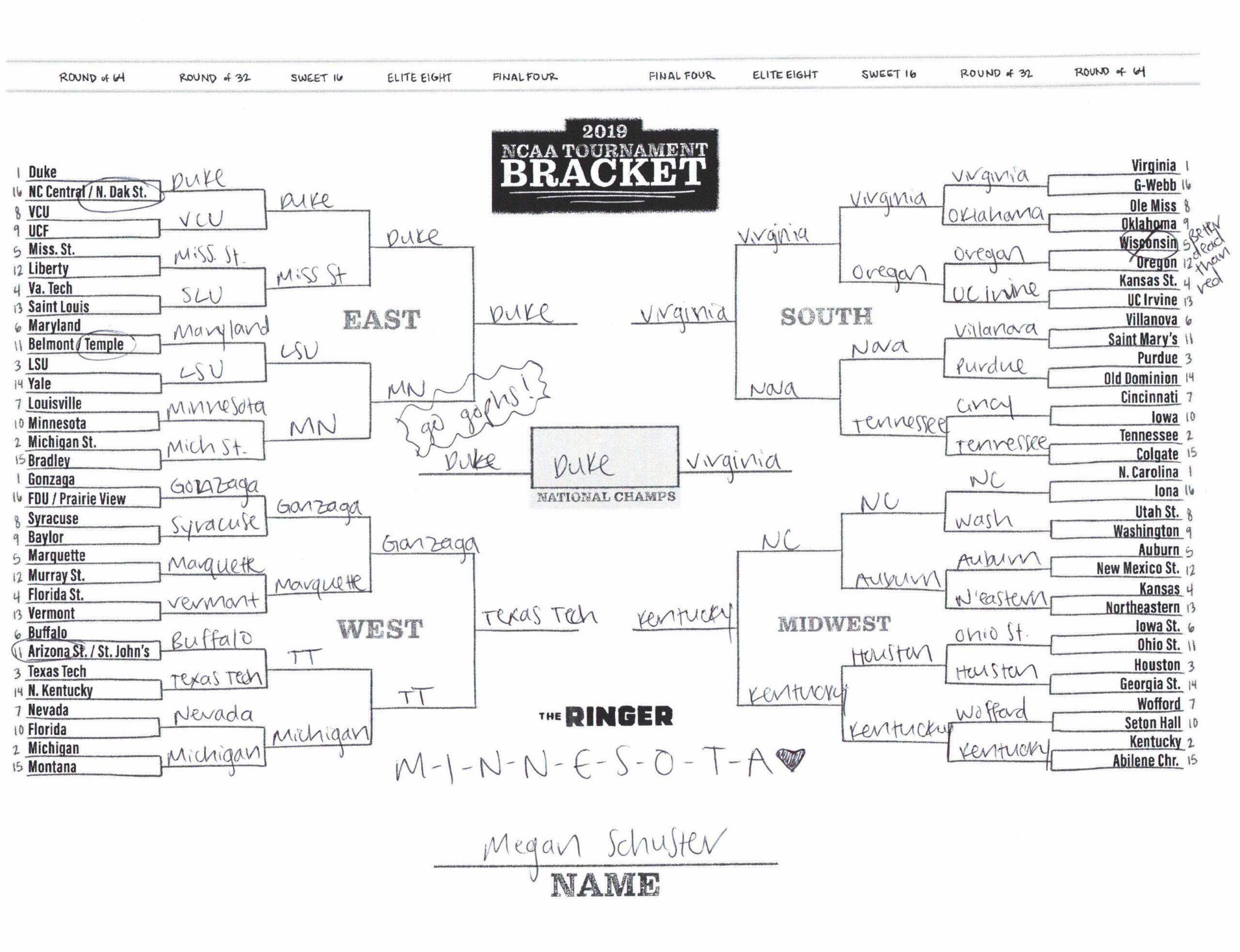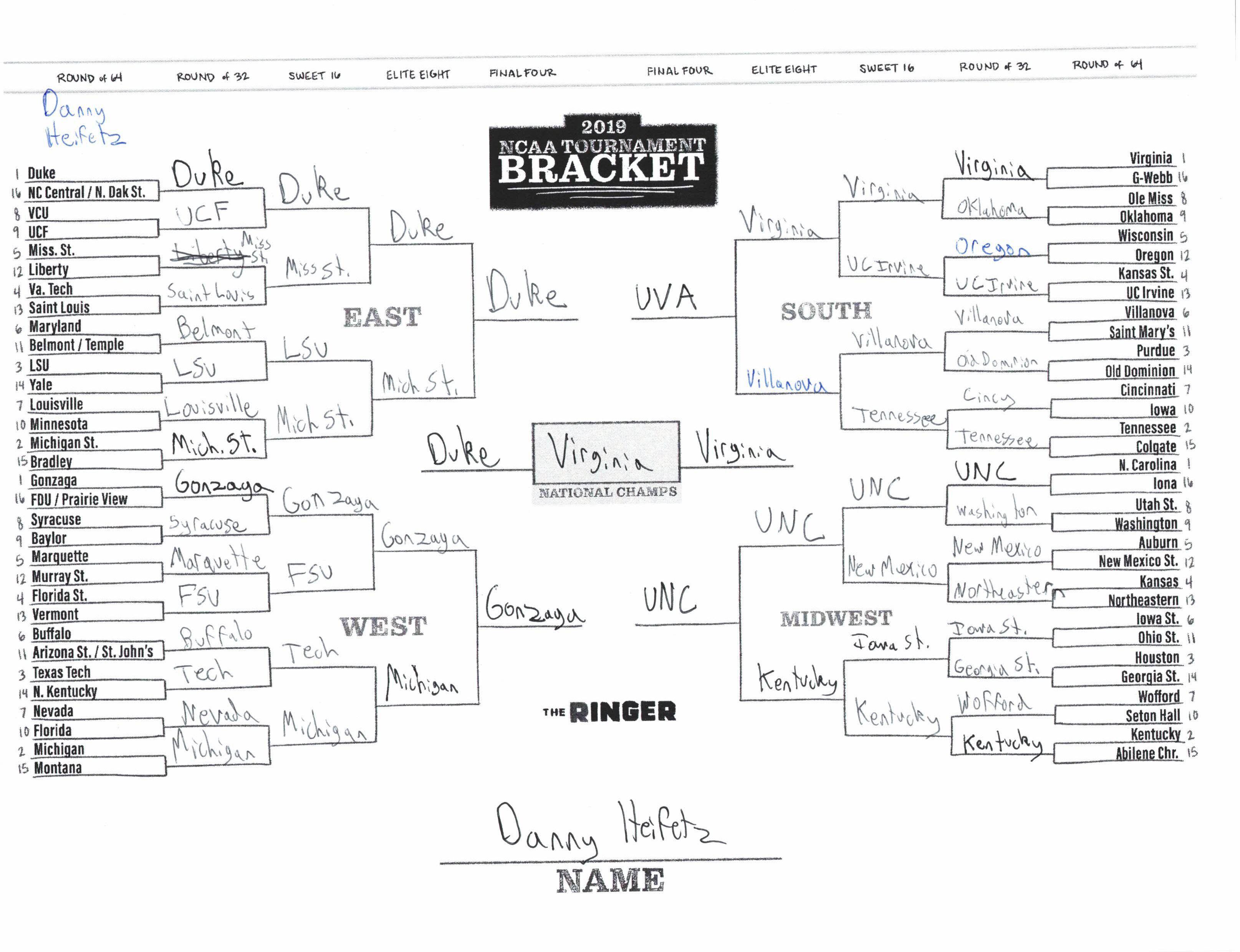 The 2019 NCAA tournament is here, and that means it’s time to talk about Zion, office pools, Zion, Cinderellas, and Zion. It also means that it’s time for Ringer staffers to publish their sure-to-be-accurate March Madness picks. Some of the brackets below were filled out by people who know the correct way to spell Mike Krzyzewski. Others were filled out by people who believe that Ja Morant was a contestant on The Masked Singer. All are guaranteed to be right.