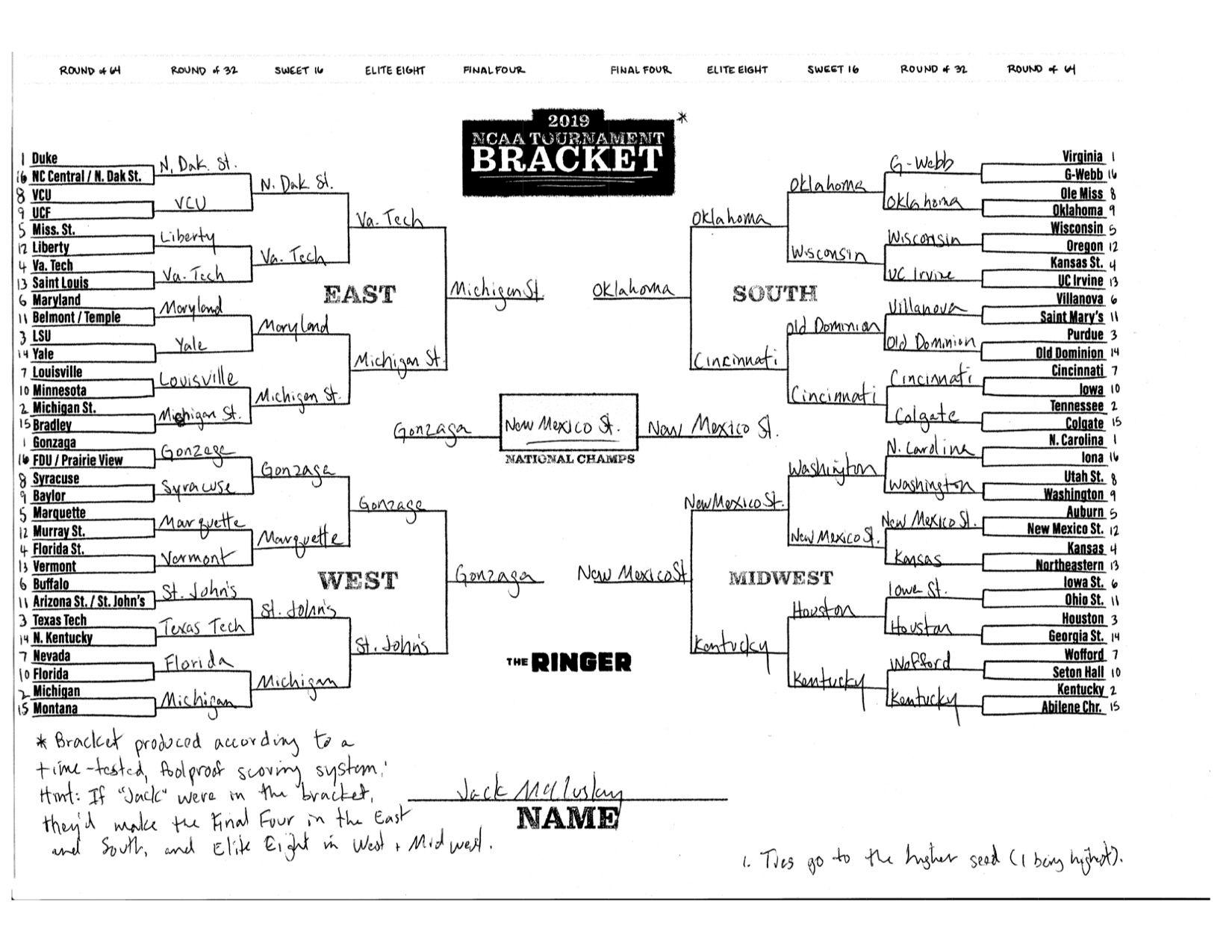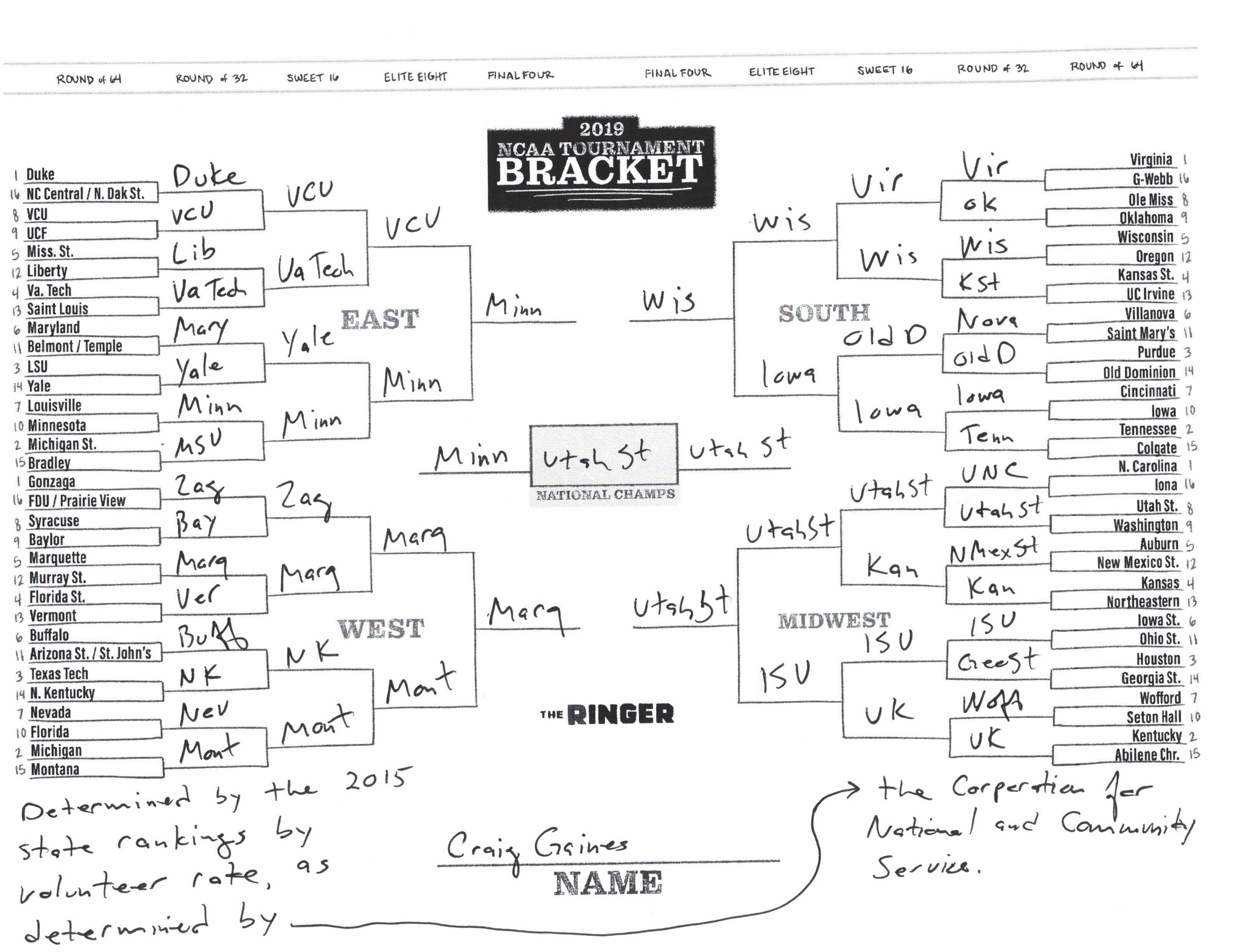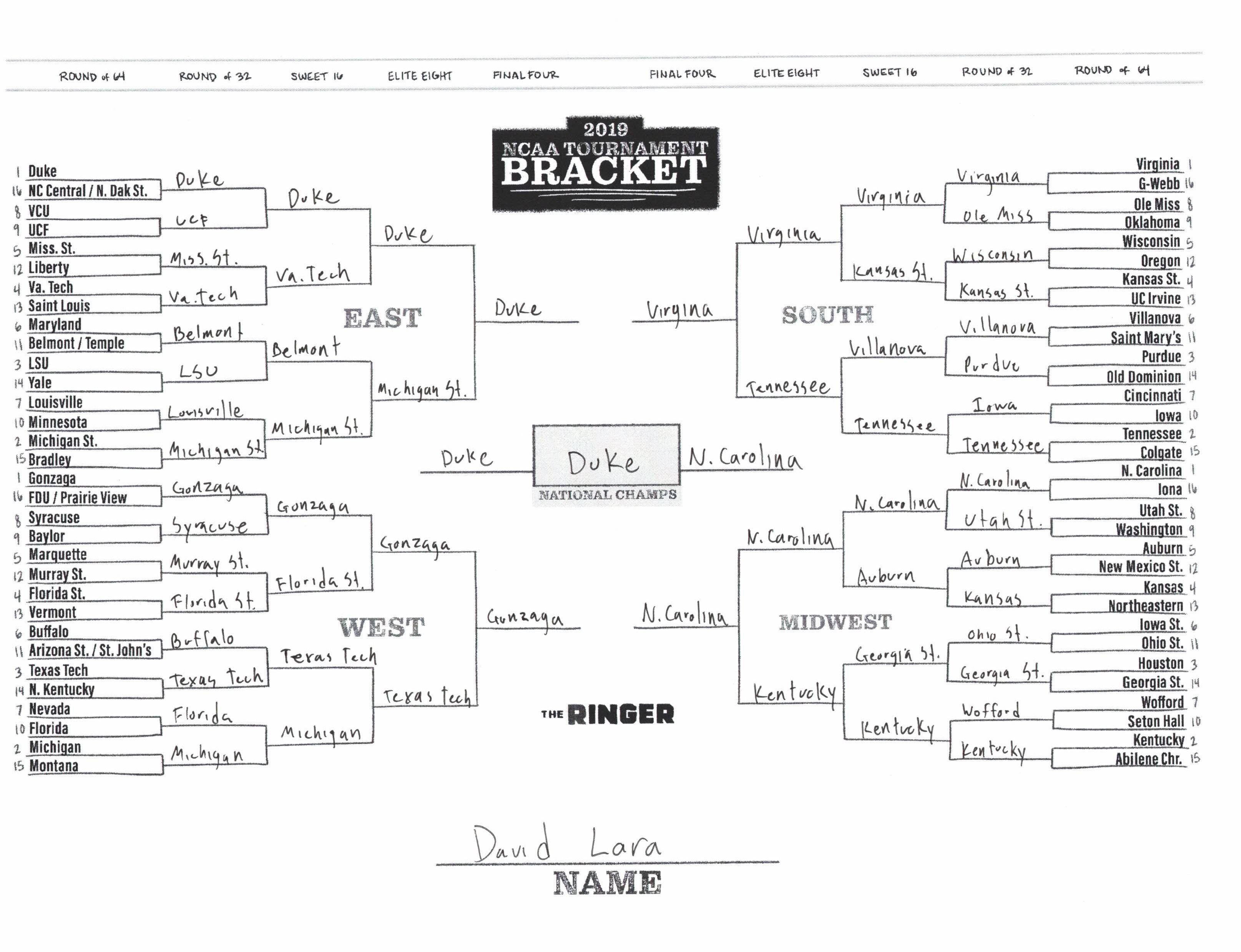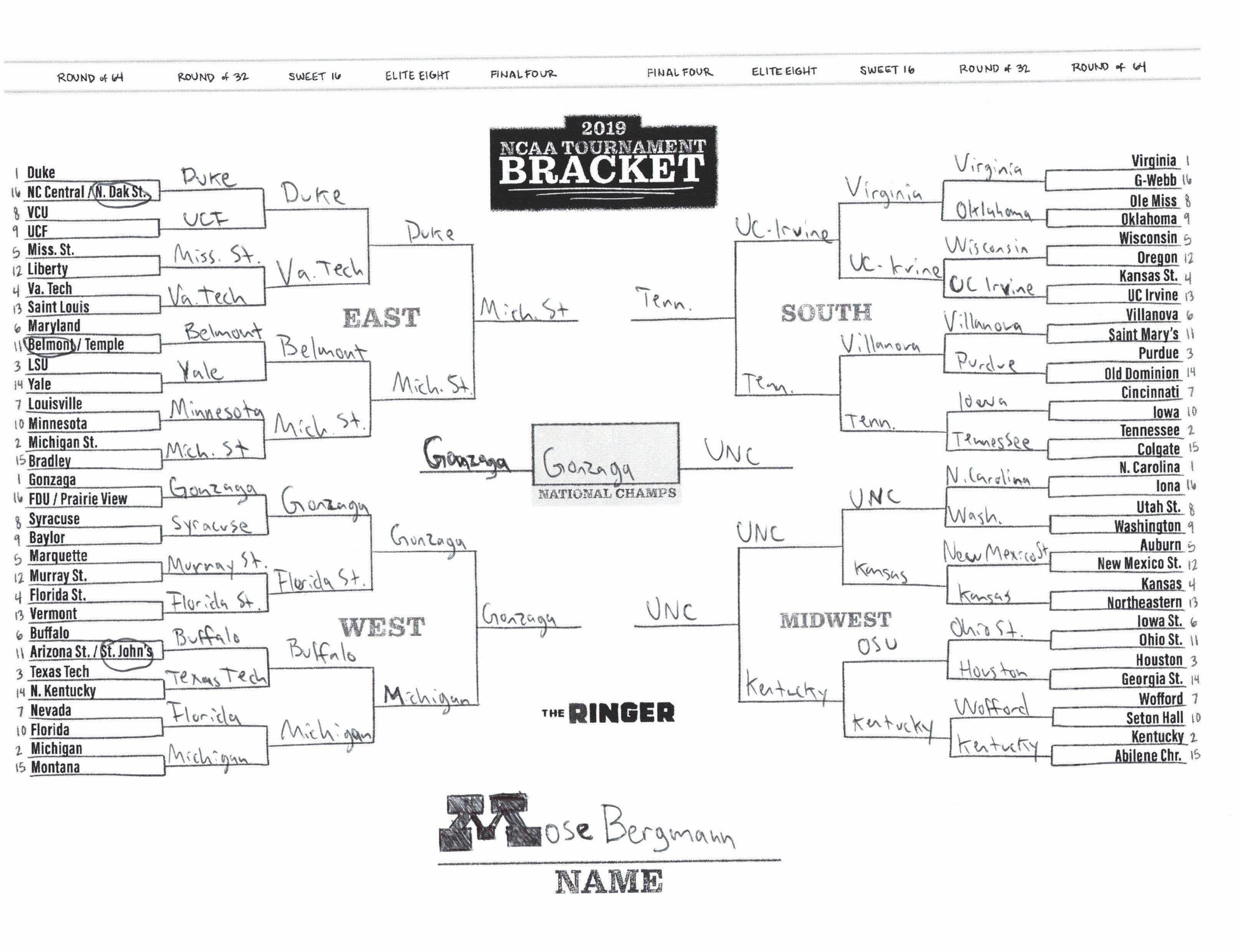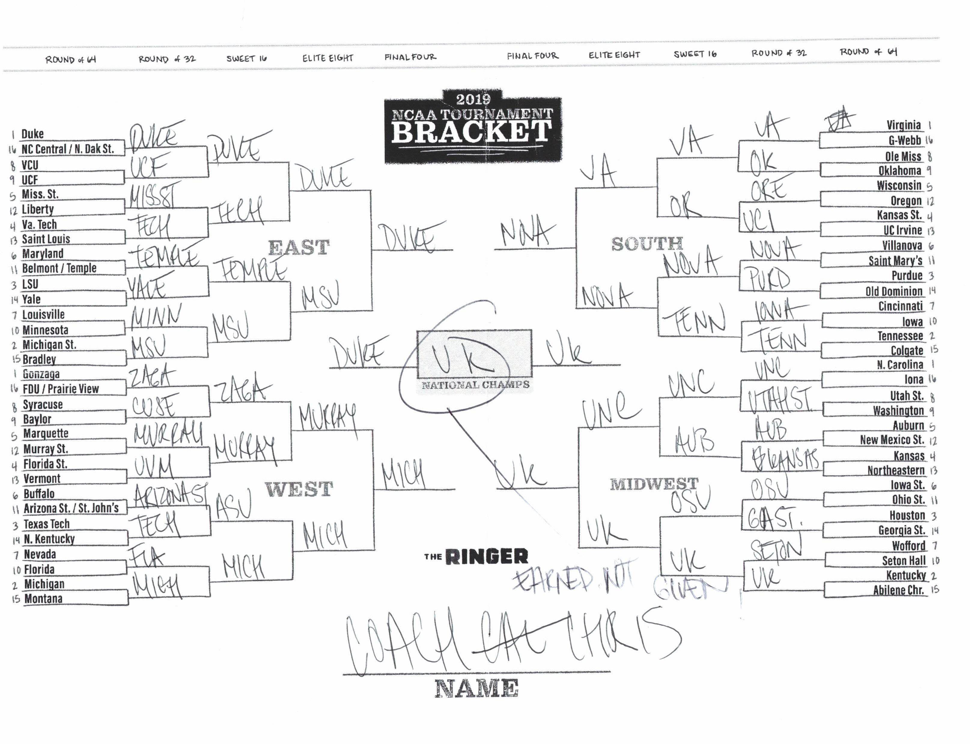 The 2019 NCAA tournament is here, and that means it’s time to talk about Zion, office pools, Zion, Cinderellas, and Zion. It also means that it’s time for Ringer staffers to publish their sure-to-be-accurate March Madness picks. Some of the brackets below were filled out by people who know the correct way to spell Mike Krzyzewski. Others were filled out by people who believe that Ja Morant was a contestant on The Masked Singer. All are guaranteed to be right.