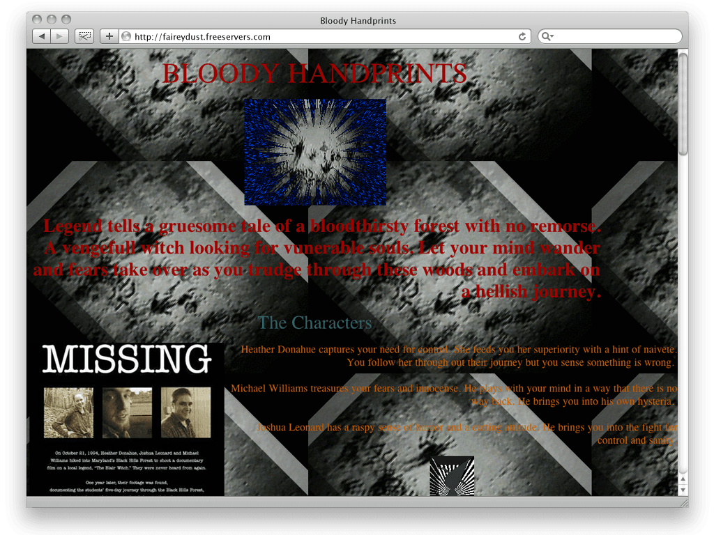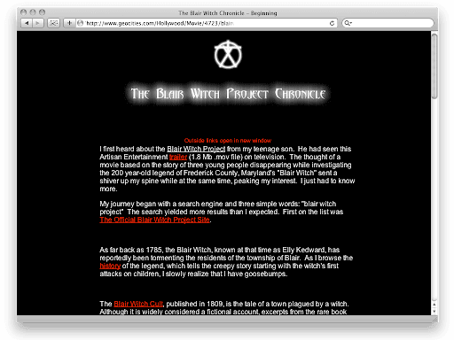 In today’s parlance, Haxan Films created an “expanded universe” for Blair Witch, long before anyone really knew what that was. They filled out a story line with enough rich details to fuel endless discussions. Soon enough, people became scholars of the mythology, and built their own websites to sift through the clues that blairwitch.com fed to them. The creator of one page called “The Blair Witch Project Chronicle” explained exactly how he became enamored of the legend: After his teenage son showed him the movie trailer, he searched for “the blair witch project” online and stumbled upon the website. “As I browse the history of the legend, which tells the creepy story starting with the witch’s first attacks on children, I slowly realize that I have goosebumps,” he wrote.