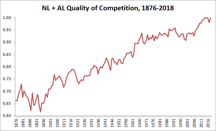 A long list of factors can affect MLB’s quality of competition, including the size of the pool of potential players (which has expanded through the breaking of the color line, the growth of the domestic population, and the internationalization of the sport); competition from rival baseball leagues, other sports, and nonathletic forms of entertainment; skyrocketing salaries and stronger incentives to pursue playing baseball; expansion in the number of teams (which has stayed static for two decades); improvements in player evaluation; and increasingly, improvements in player development. For our purposes, though, it doesn’t matter so much why contemporary players are better; whether it’s mostly talent or mostly nutrition or training, the result is the same. And Lichtman’s data suggests that even 150 years into the existence of professional baseball, the sport’s quality of competition is not only continuing to climb, but is rising at one of the most rapid rates in history.