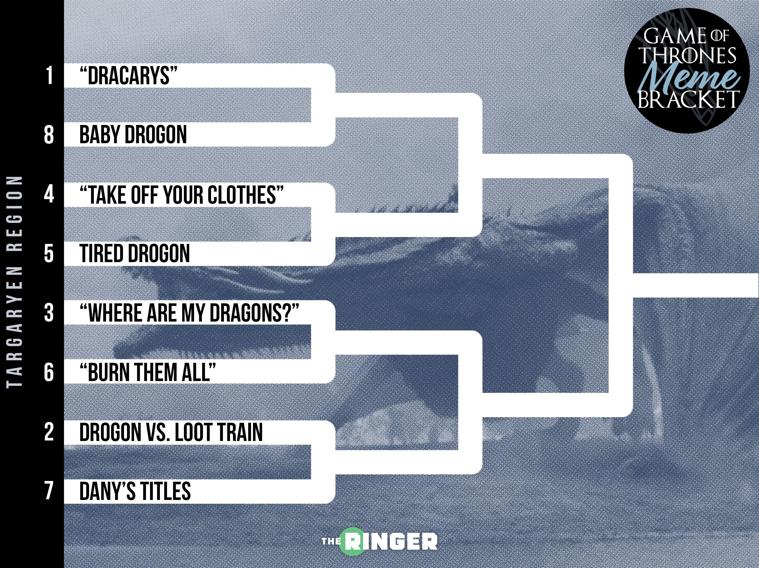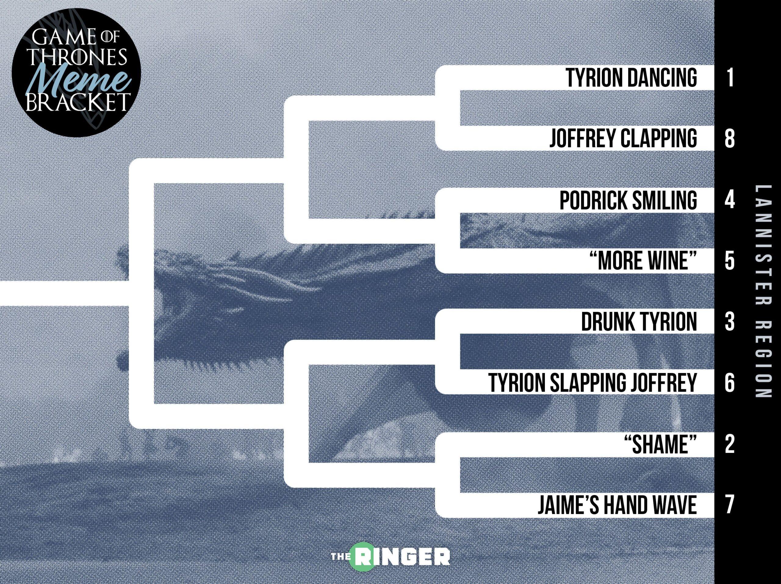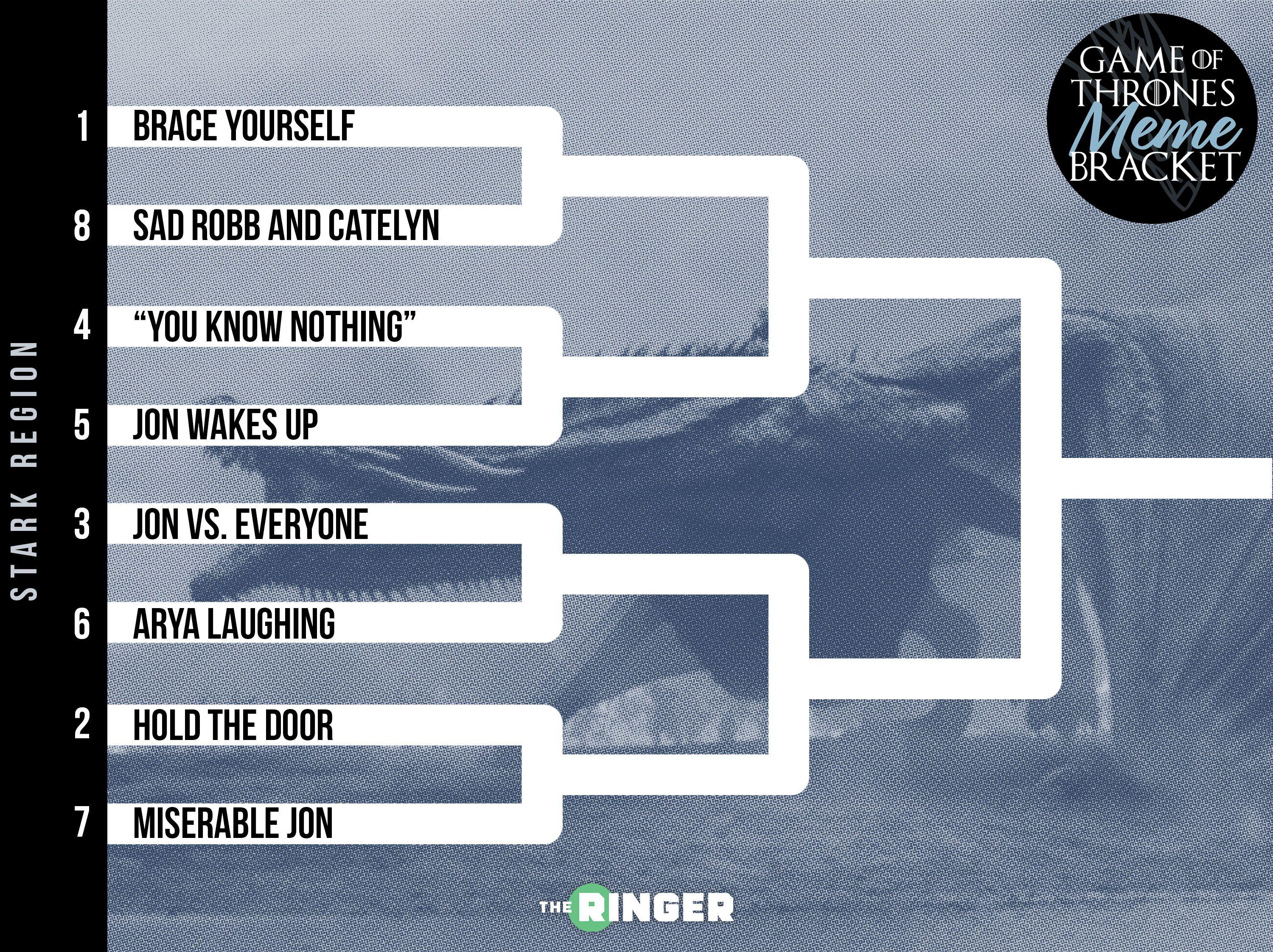 March Madness is almost over, but winter is just beginning. Less than one week remains until the final season of Game of Thrones, and to count down the end of days, The Ringer’s selection committee has whittled down the top 32 memes in Thrones history. With the field settled, we are asking you, the internet, to determine the winner of the Game of Thrones Meme Bracket. We’ll hold voting every day this week until we find one meme to sit on the internet’s Iron Throne on Friday, April 12.