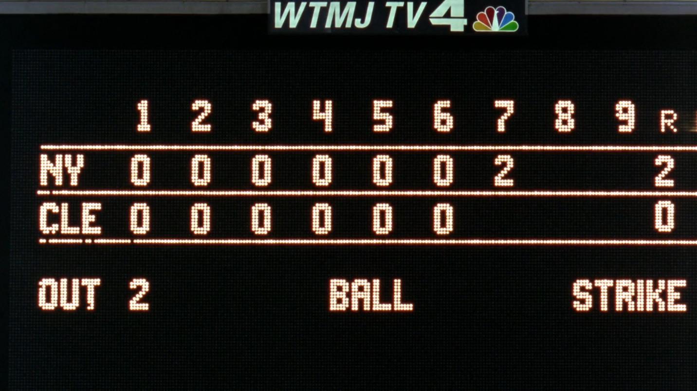 Cleveland catcher Jake Taylor bats in the bottom of the inning. Based on Harry Doyle’s play-by-play and the glimpses we get of the field, we know that there’s one out and nobody on. Taylor grounds out to short for the second out of the inning, plunging Cleveland’s win expectancy below 15 percent in a real-world scenario.