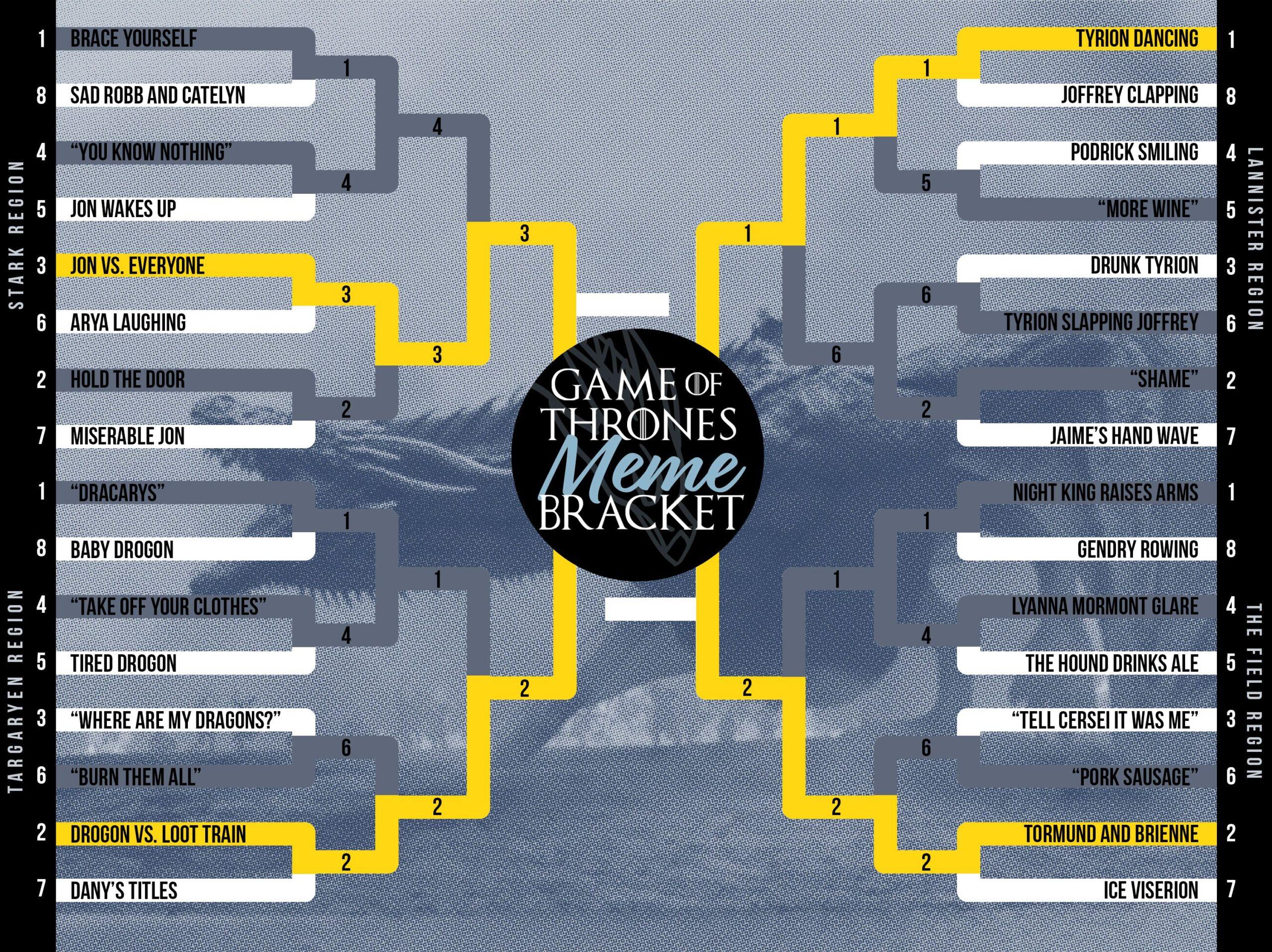 Outside of Tormund and Brienne, which took the Field Region, and Jon vs. Everyone, we also have Tyrion Dancing and Drogon vs. Loot Train advancing to the Final Four out of the Lannister and Targaryen Regions, respectively. The Drogon-Jon matchup looks to be a tough contest, and it’ll be strange watching Jon square off against the child of his aunt/lover and the sibling of Rhaegal, who maybe, JUST MAYBE, he’ll ride this season. Tyrion Dancing is the last no. 1 seed remaining in the tournament, so Tormund and Brienne will have its work cut out for it this round.