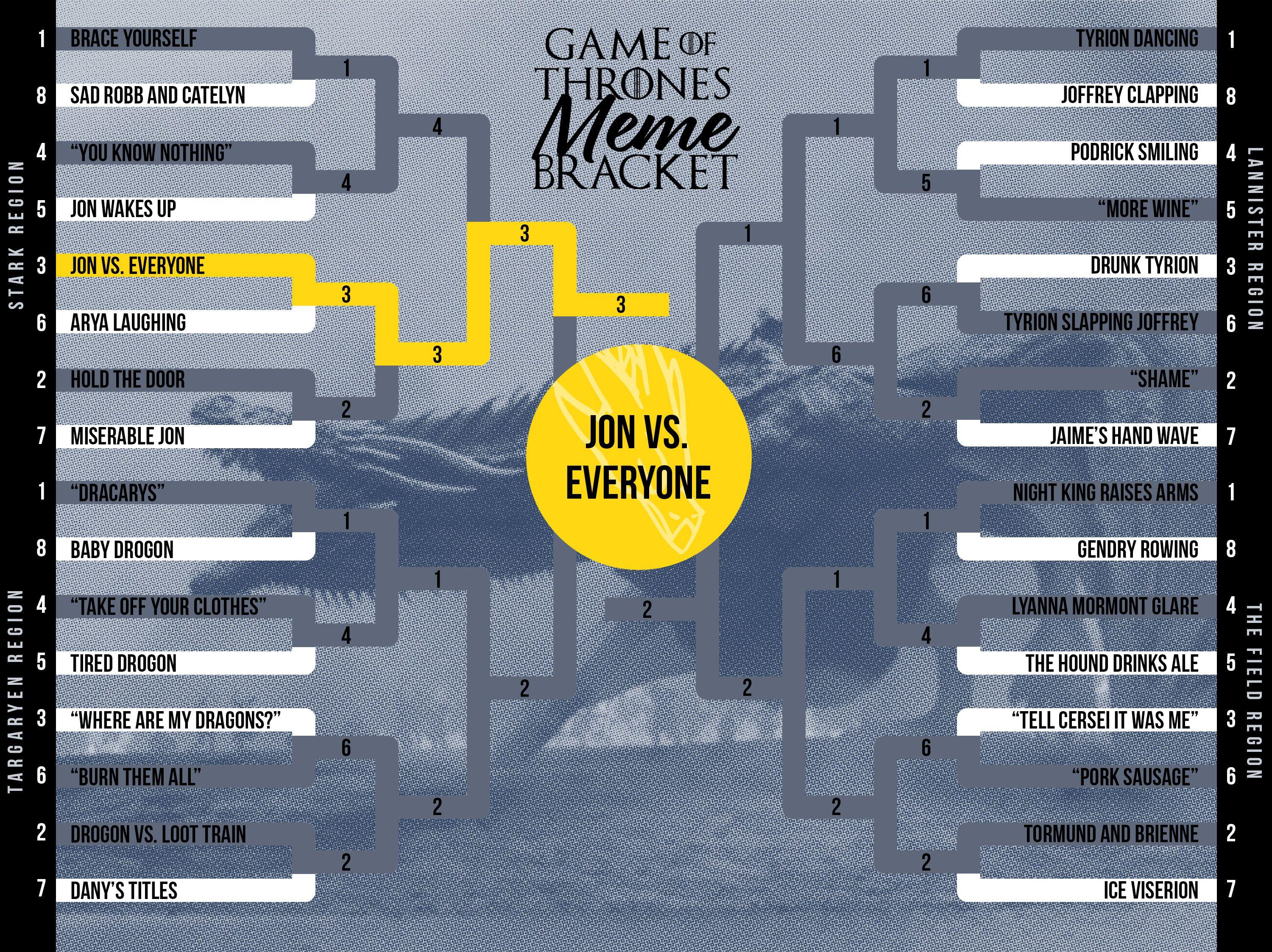 Experts (me) pegged Jon vs. Everyone as the most versatile meme in the entire bracket. But not even the most ride-or-die Stark fans could have foreseen how, to paraphrase Barristan Selmy, this meme would cut through its five opponents like carving a cake. After easily defeating Laughing Arya (78 percent to 22 percent), and “Hold the Door” (80 percent to 20 percent) in the first two rounds, Jon vs. Everyone vanquished “You Know Nothing” in the Elite Eight (62 percent to 38 percent). But it was Jon vs. Everyone’s performance on Thursday that landed it among the most dominant memes of our time, drubbing Drogon vs. Loot Train, 83 percent to 17 percent. It is perhaps the most dominant victory in the history of meme bracketology.
