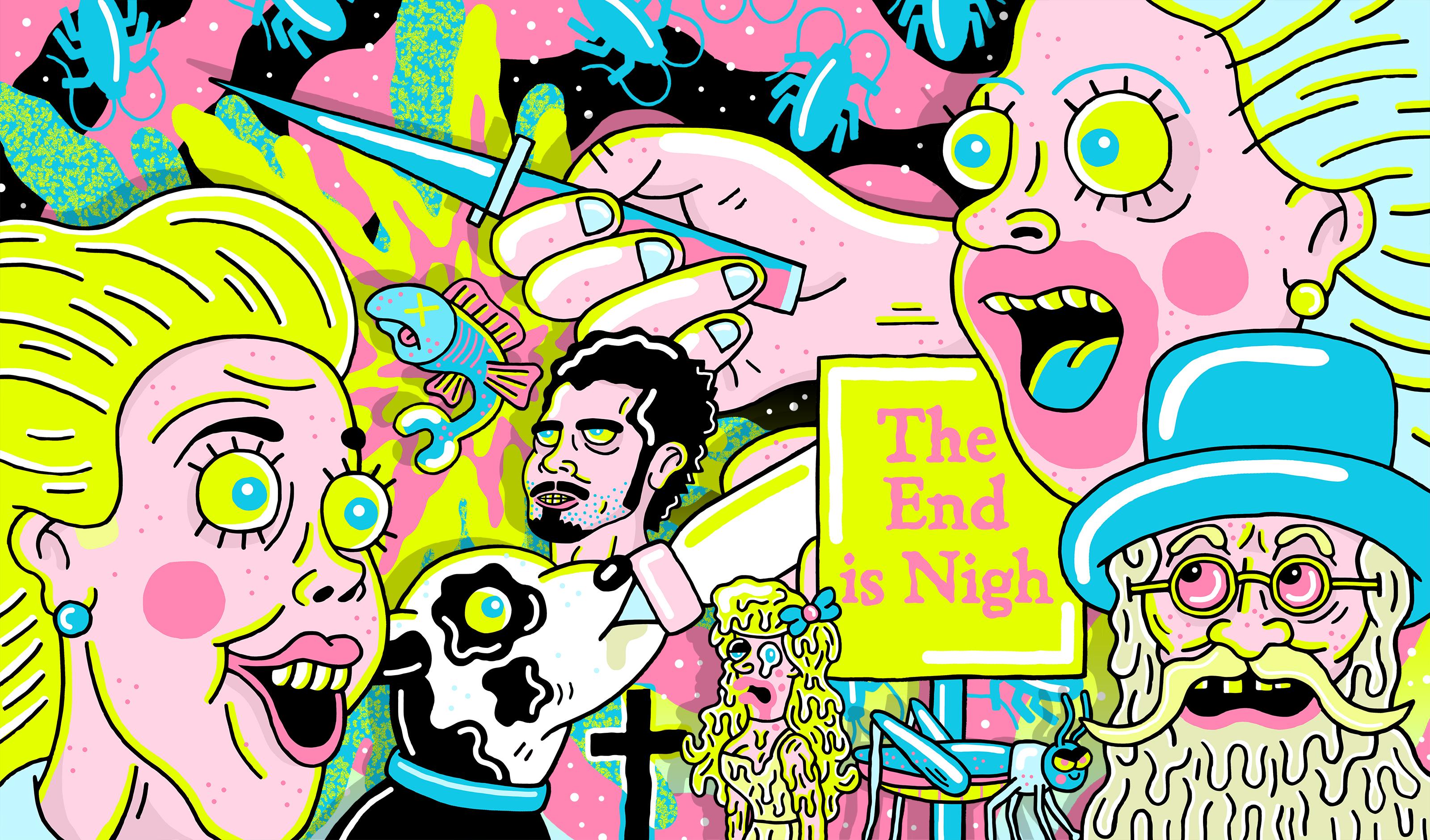 And that they did. There’s a deranged bearded preacher, a lipstick-applying lady strapped into a vibrating massager checking out an oiled-up beefcake doing push-ups, a swimsuit-clad woman who shows off a serpentine tongue, and kids frying bugs with a magnifying glass. “I remember Barbie being roasted on a spit,” Thayil said. The girl drooling melted ice cream has also always stuck with him. “When I told her to spit the ice cream out, her mother was just behind her,” Greenhalgh said. “She was horrified that there was her pretty little daughter and she was just vomiting ice cream.” Thayil’s solo kicks in when a glowing CGI black hole, which looks like a mutated version of the one in the photograph that astronomers revealed last week, begins to suck up everyone in its path.