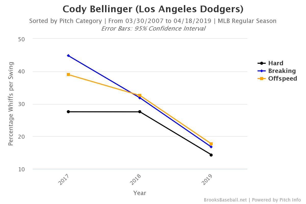 Bellinger’s second change is improved contact skills when he does swing. Against all sorts of pitches, he’s whiffing way less than he has in the past.