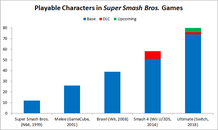 Melee featured 26 characters, more than double the original’s lineup of 12. Each subsequent sequel has further upped the ante in terms of character count. With a current tally of 76—including all 63 of the fighters featured across the previous four Smash games—Ultimate, which came out in December, is two downloadable additions away from tripling Melee’s complement of characters.