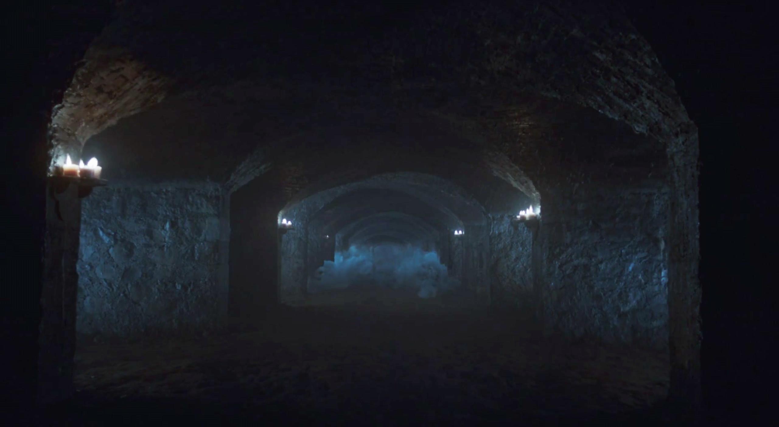 In the “Crypts of Winterfell” trailer, we see that cold breath creep through the crypts toward Jon, Sansa, and Arya.