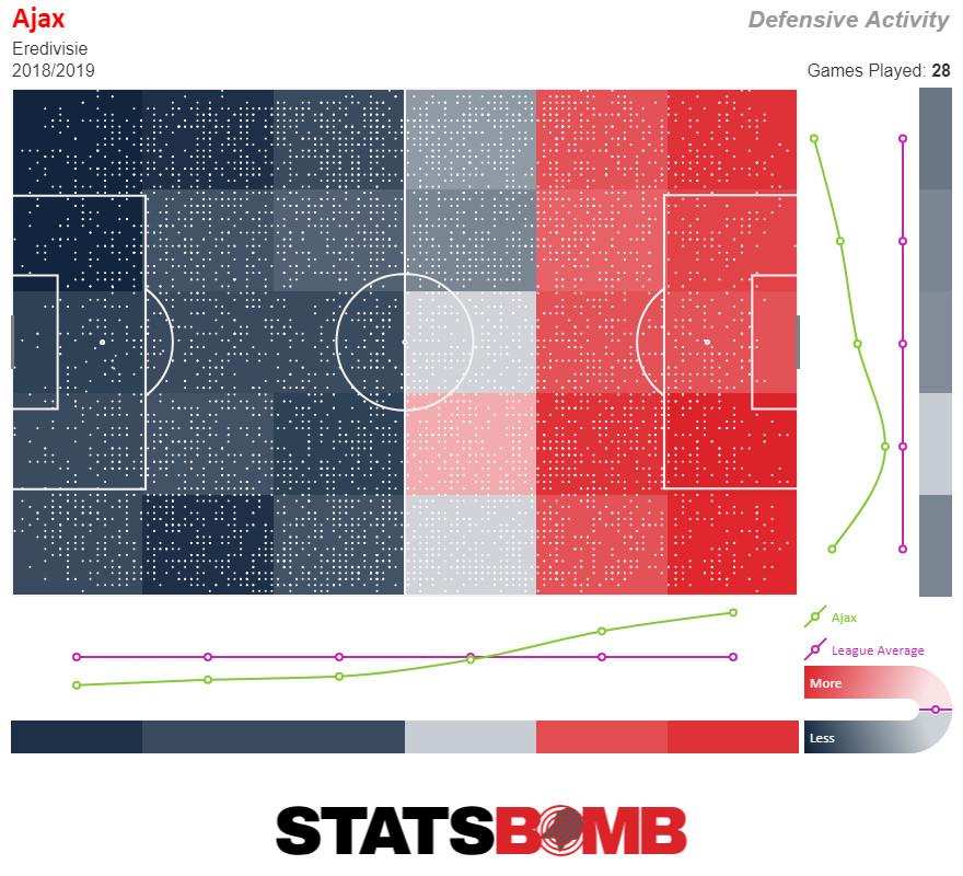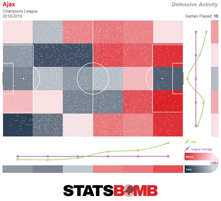 It should, in theory at least, be harder to maintain that intensity in the Champions League, where Ajax faces stronger defenders, trickier midfielders, and faster strikers than they see in the Eredivisie. And yet, their defensive pressure map says otherwise: