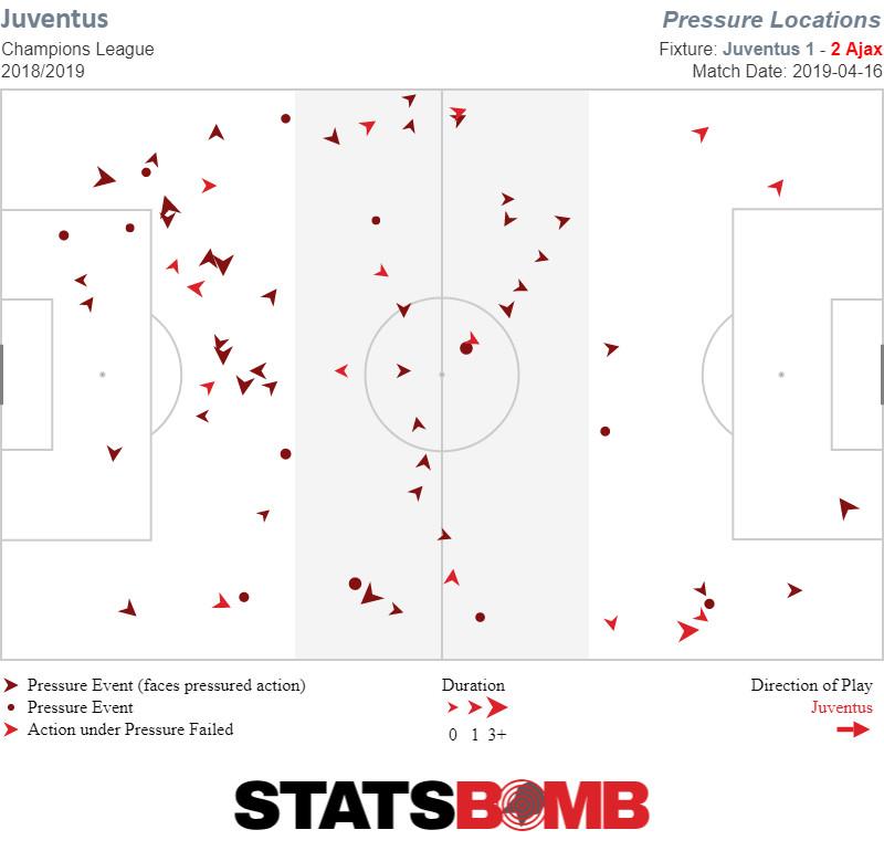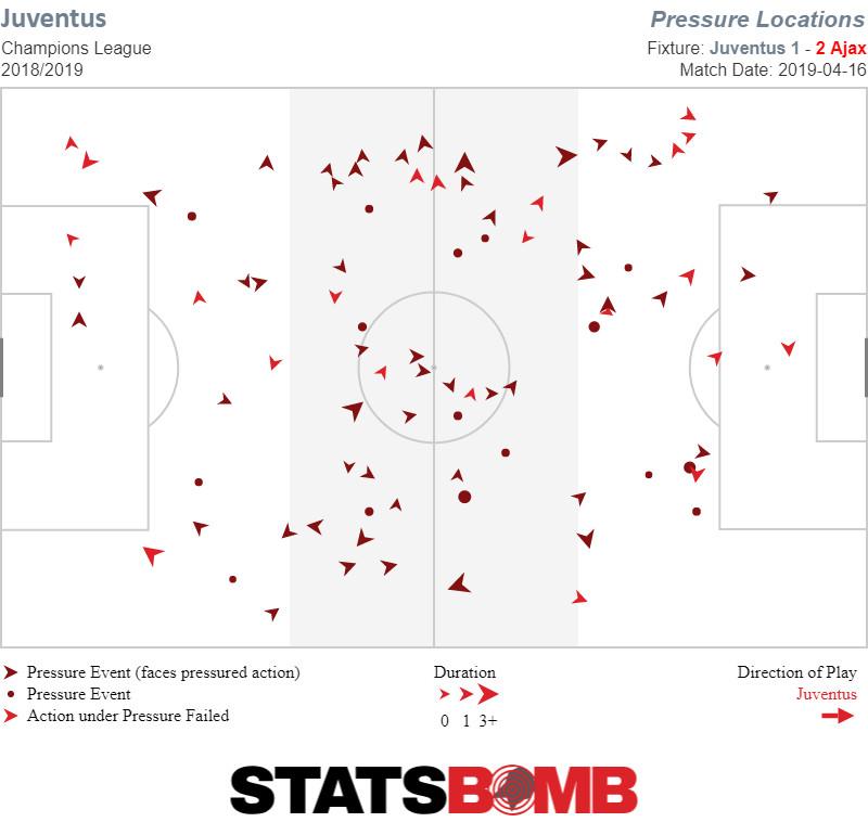 For inspiration, they could look to the first half of the second leg of the quarterfinal between Ajax and Juventus. In that match, Juventus managed to keep Ajax and De Jong under control by denying him the ball in dangerous midfield areas and denying him the ability to turn and create when he dropped back to receive it. Juventus forward Paulo Dybala was particularly influential, logging 14 defensive pressures, helping the even more active midfielders behind him, Blaise Matuidi, Emre Can and Miralem Pjanic, record 18, 16, and 14 defensive events, respectively.