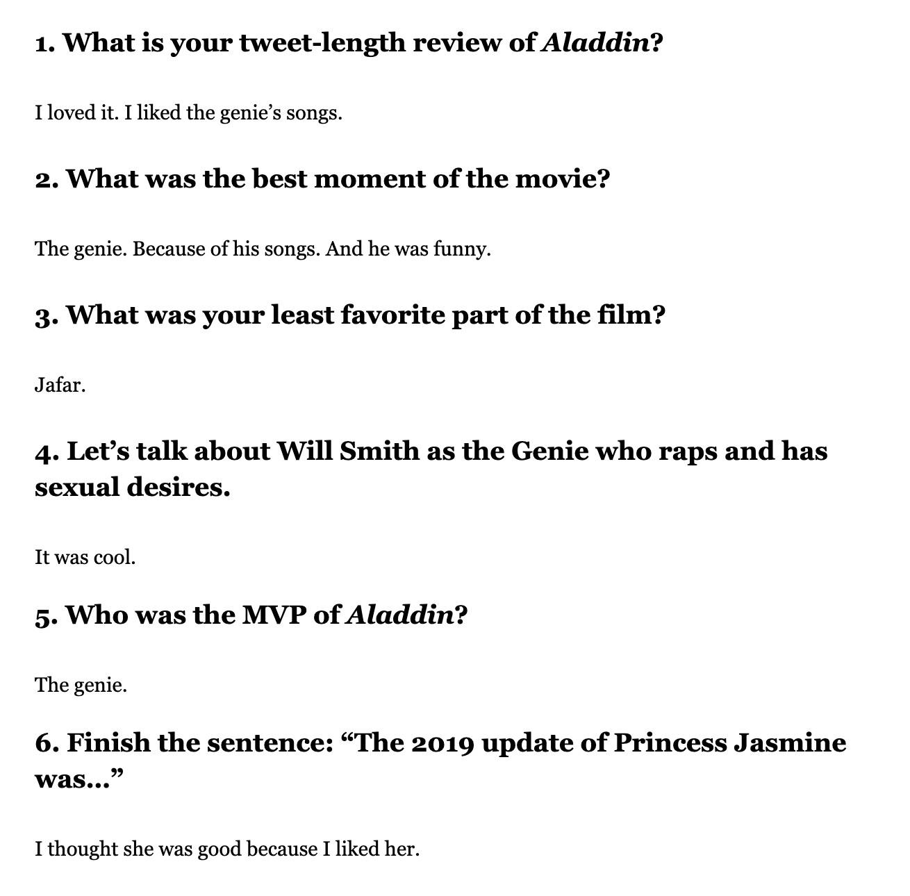 1. What is your tweet-length review of Aladdin?