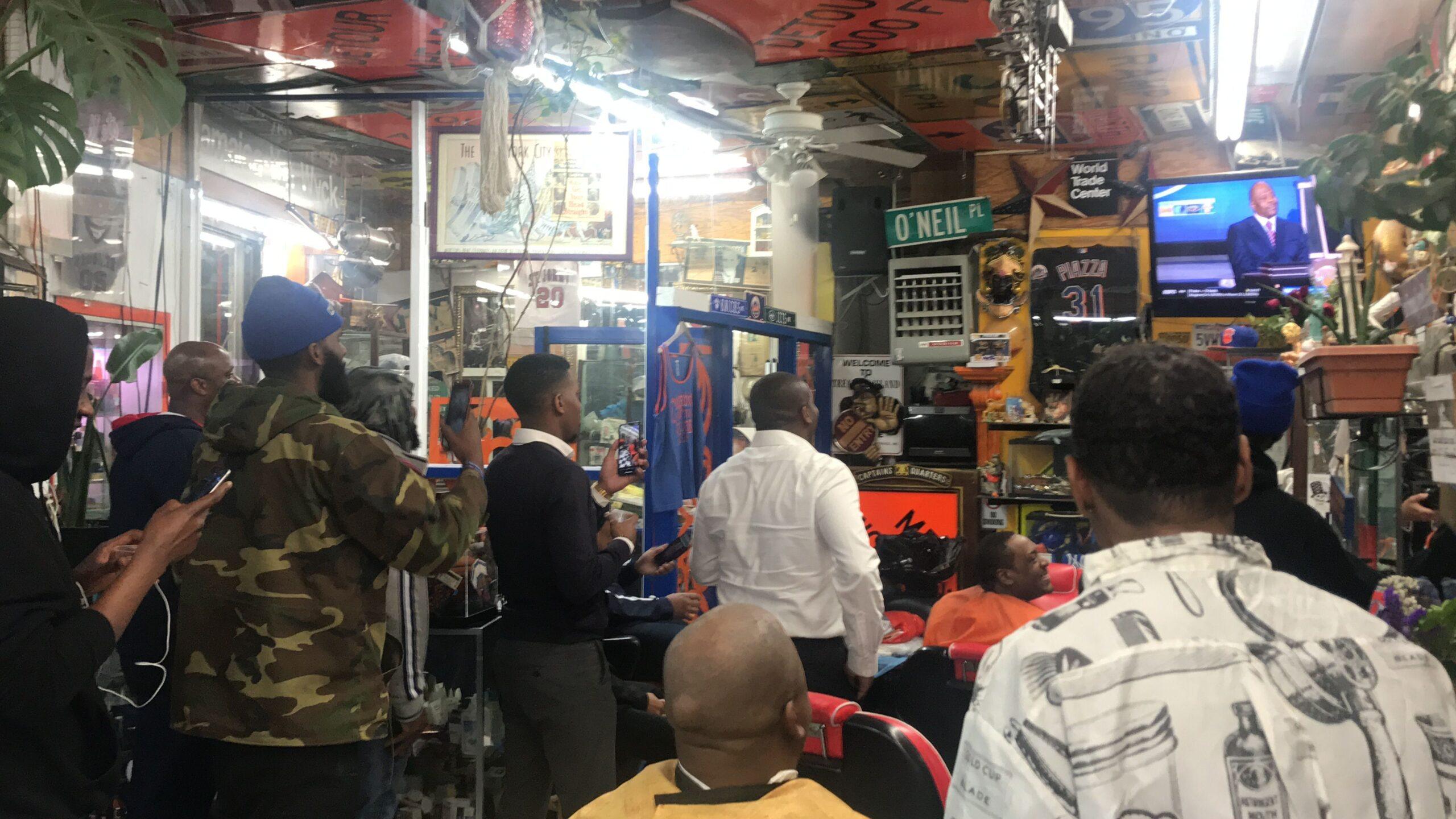 Small cups of Patrón mixed with strawberry lemonade are dispensed, and a man named Avalon Daniels, who is wearing a Larry Johnson jersey and is there with his 12-year-old son, asks if I have rubbed the Buddha. Liquid courage and luck are needed right now, because the lottery is starting and the odds are long. Thirty-year-old McKenzie LeBranch sits in a barber chair, wearing a blue hat and looking at the nervous faces and restless pacing around him. “This is like the election, when Trump was about to win,” he says.