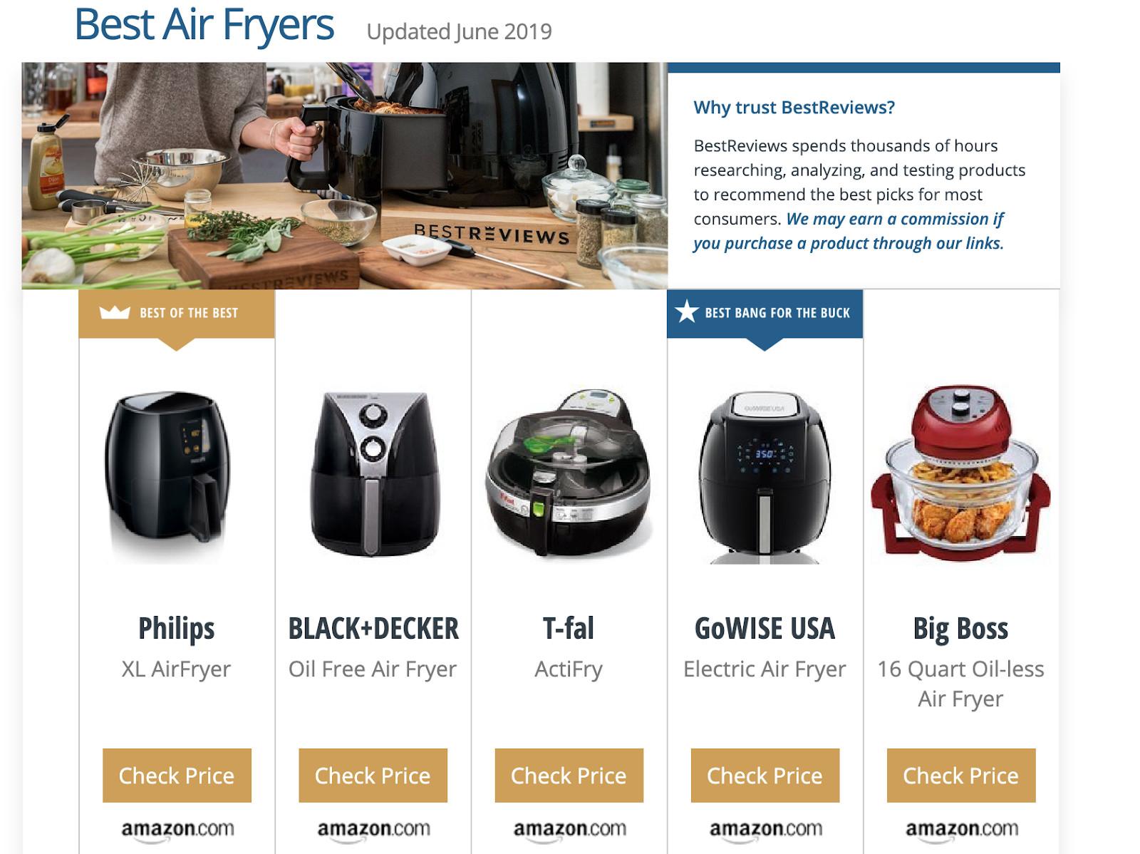 In reality, BestReviews replicates the look and feel of a thoroughly researched recommendation website, without putting in the same amount of work. Take its entry for the best air fryers, for instance. The standard design includes an illustrated comparison grid of the top five product models with “Pros,” “Cons,” and a “Bottom Line,” highlighting the item in the lineup that BestReviews considers “the best of the best” and the “best bang for the buck.” Beneath that feature is a small graphic that shows the effort put into this evaluation process, by the numbers: “models considered” (88), “hours researched” (49), “experts interviewed” (2), and “consumers consulted” (238).