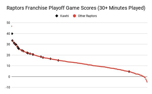 The black diamonds on this graph denote all of Leonard’s game scores this postseason. The red circles denote all other game scores in franchise playoff history (among players with at least 30 minutes played). Look how closely concentrated Leonard’s diamonds are to the left, with the exception of one bad outlier game—his 5-of-19 shooting effort in Game 3 of the first round against Orlando. Every other game this spring inspired a solid Leonard performance, or better.