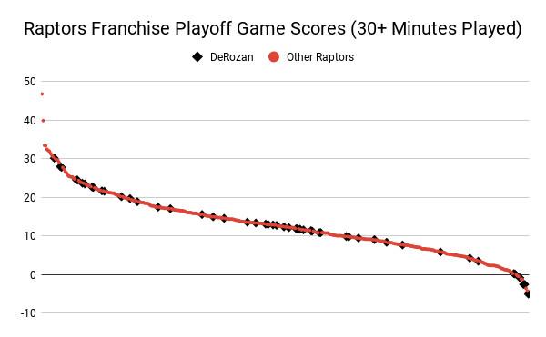 The most tragic part of this graph is the reverse end of the leaderboard, home to DeMar DeRozan—the main player Toronto traded away in its package deal to acquire Leonard last July. DeRozan enjoyed plenty of excellent playoff games in Toronto—he has 10 of the top 50 games on the graph—but also struggled often under a playoff glare. The worst game on that graph belongs to DeRozan, when he somehow collected a negative-5 game score in one 2016 loss to the Heat. Overall, six of the 13 worst games belong to the man now growing stronger alone. Here’s that graph again, with all of DeRozan’s games highlighted instead of Leonard’s.