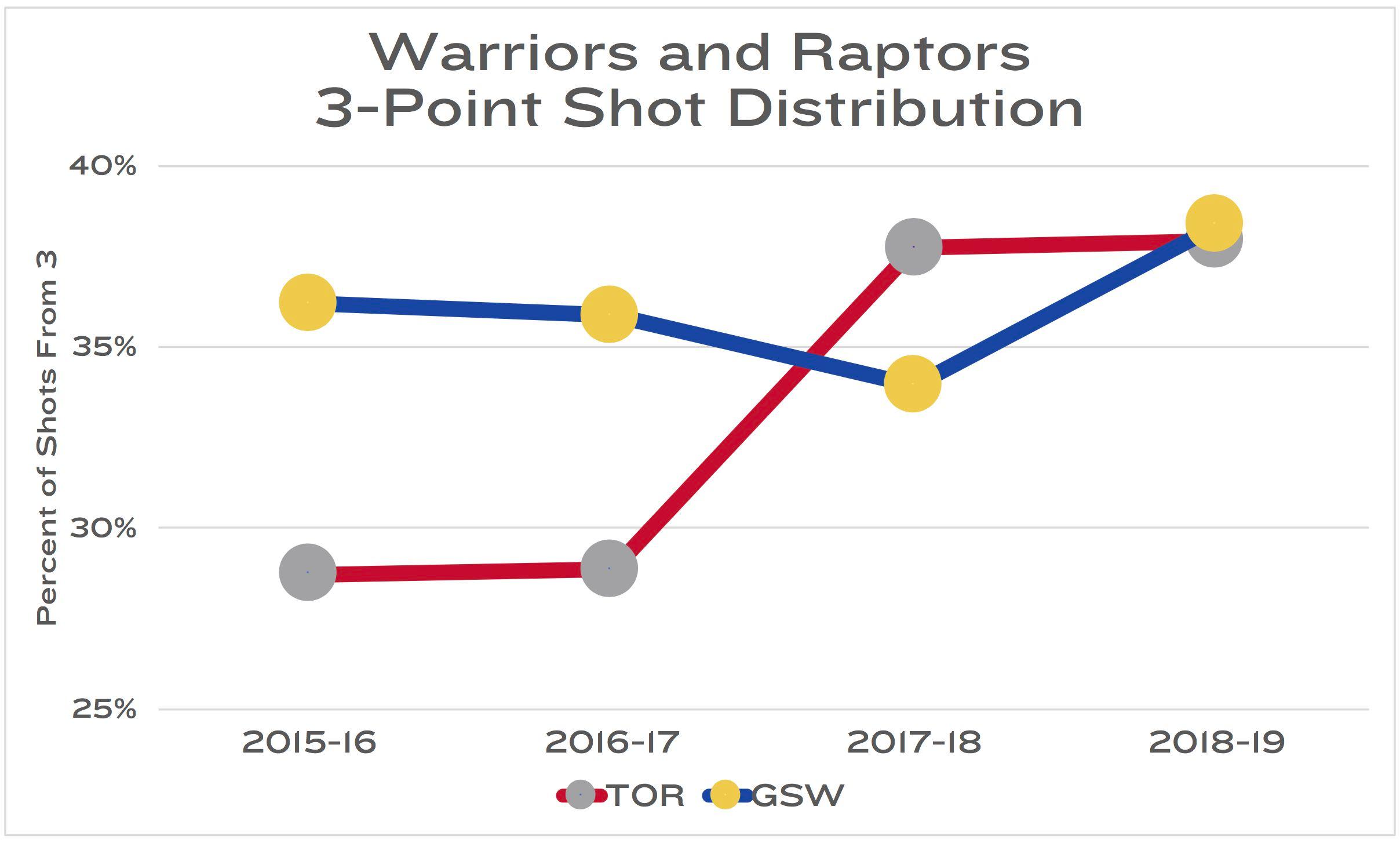 Golden State’s stagnation is most clear when juxtaposed against Toronto’s evolution. The Warriors attempted 36.2 percent of their shots from 3 during their historic 73-win season in 2015-16, which was second in the NBA, compared to just 28.7 percent for the Raptors, which ranked 15th. This past season, 38.4 percent of Golden State’s shots were 3s, while 37.9 percent of the Raptors’ shots came from beyond the arc—a mere decimal point difference. In the Finals, they were near equals: The Warriors tried 40.9 percent of their shots from 3, while the Raptors took 40.7 percent. While the Raptors and the rest of the NBA shoot more 3s, the Warriors are pretty much staying the same.