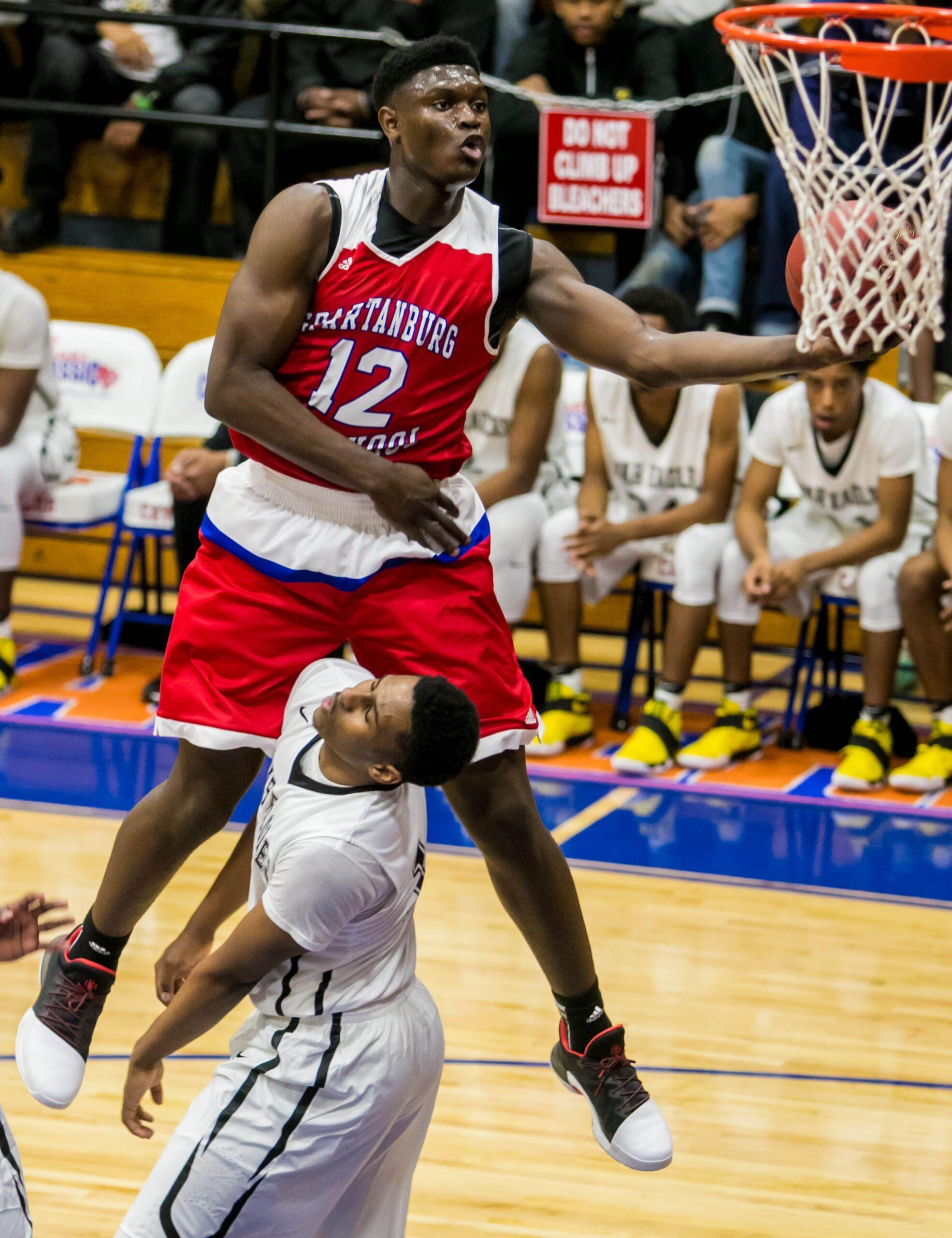 Williamson showed up with the Hornets’ 17-and-under team. They were a local community team, nothing like the AAU powerhouses that recruit from across the country; “the kind of team where it’s kids on the weekend raising money selling Krispy Kremes,” says Young. Yet Williamson immediately made his mark on the tournament. “The first two plays of the game, he came down the middle dunking like LeBron,” says Ryan Falker, who coached another team at the tournament, Atlanta-based Game Elite. “He was 6-4, about 185 pounds. Then I found out he was only 14.”