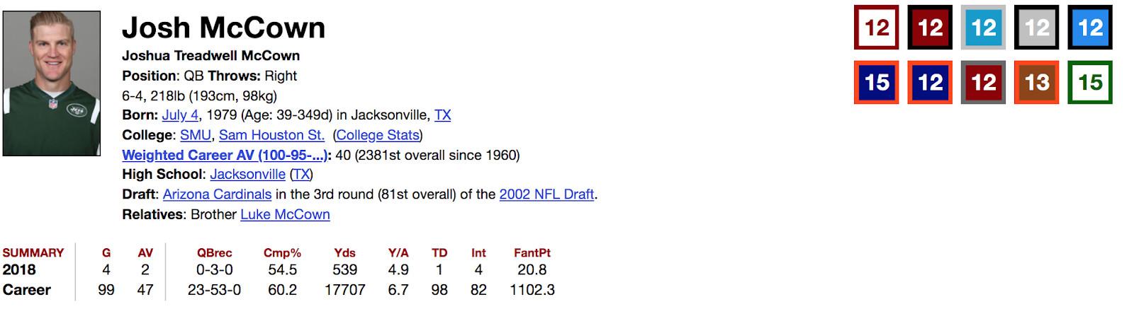 On the indispensable stats website Pro-Football-Reference, each individual player page lists every jersey number that player has worn throughout their career. It’s a charming detail: Their jersey numbers float in the top right corner above their statistics like jerseys hanging from the rafters above the scoreboard of their own personal arena. They color the page and our thoughts in a way statistics cannot. For almost all of these pages, the jerseys are a brilliant detail, but for a small group of players the jerseys tell their story better than the numbers ever could. One of those players is quarterback Josh McCown, who has filled out not one, but two rows of jerseys on Pro-Football-Reference.
