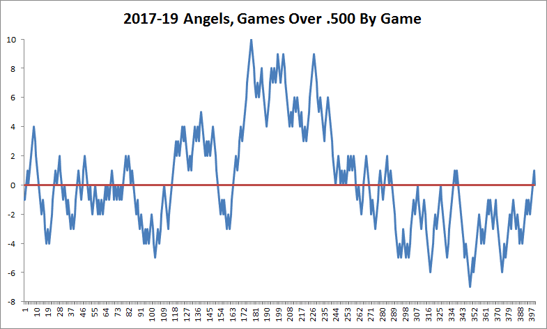That’s a really narrow range. Since the start of 2017, the Angels—who finished 80-82 in each of the past two seasons—have never been more than 10 games above .500 or more than seven games below. The last time they topped 10 games over was July 28, 2015, and by the end of that season, they sported a negative run differential.