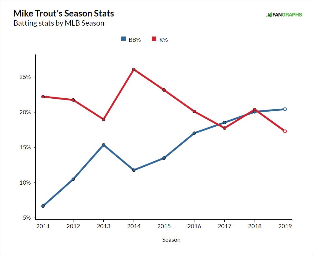 In his superb rookie season, Trout struck out more than twice as often as he walked. The league as a whole has seen its strikeout rate rise by 3 percentage points since then, but Trout’s has decreased by 4.5 percentage points during the same span, and his walks have now outstripped his strikeouts by a wide margin. He’s been ahead in the count on more than a third of the pitches he’s seen this season, and ranks seventh in that category among the almost 300 hitters who’ve faced at least 500 pitches in 2019.