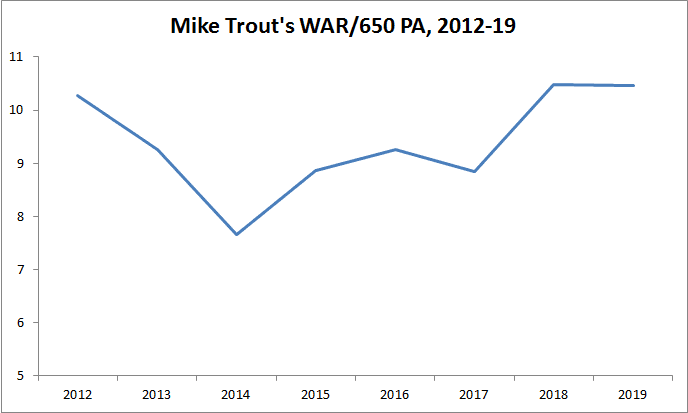 Trout’s elite offense, coupled with his still-strong fielding and baserunning, has put him on pace for an 11-WAR season, which would be his best. On a per-plate-appearance basis, his performance since the start of 2018 has been his best yet, which is saying something for a hitter who had two MVP awards and three runner-up finishes by the end of his age-24 season.