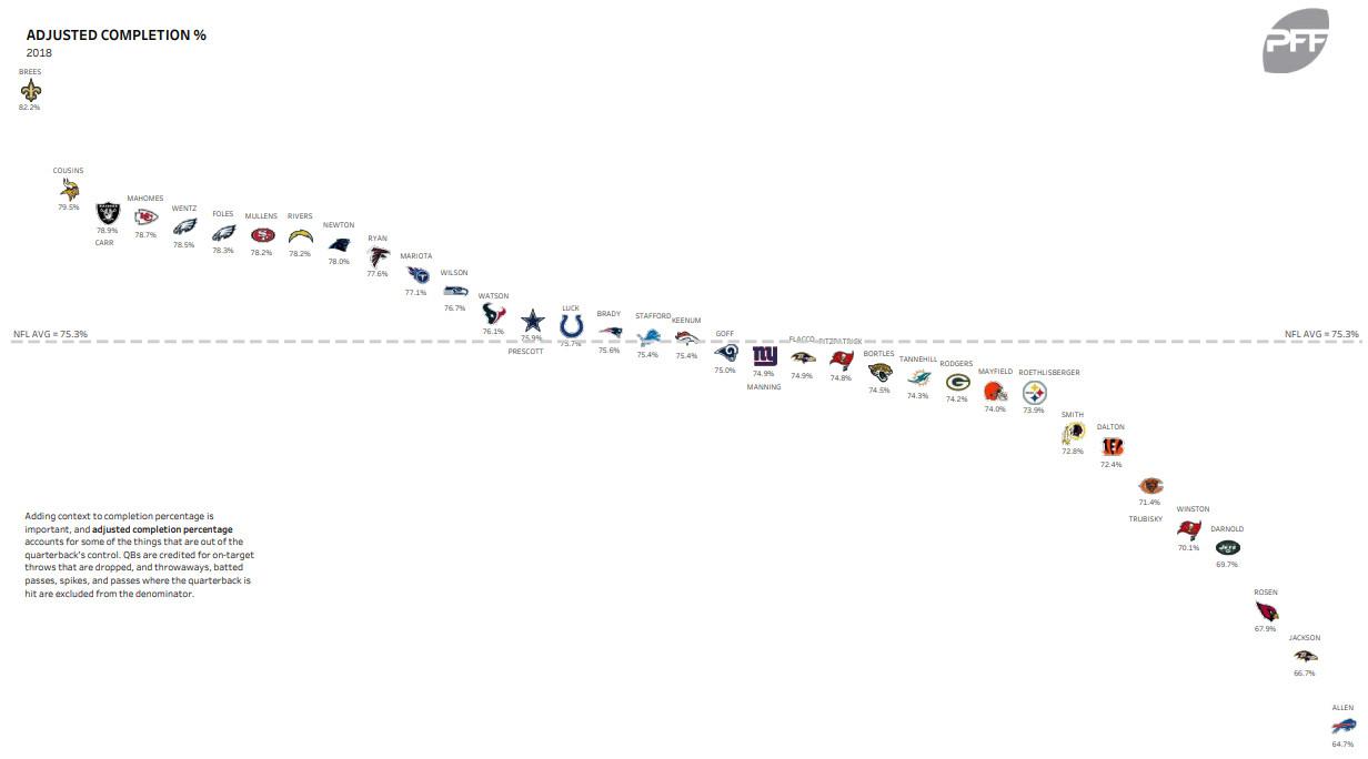 Completion percentage can be conflated with accuracy, but not all passes are created equal. (A 40-yard touchdown pass and a 4-yard checkdown both count as a completion, but they are not the same difficulty.) But Brees also led the league in Completion Percentage Above Expectation from NFL Next Gen Stats, which accounts for where the receiver is on the field, how close the nearest defender is to the receiver, and how close the quarterback is to being hit at the time of the throw. Using a third metric—Pro Football Focus’s adjusted completion percentage which removes drops, throwaways, batted passes, pikes, and throws when the quarterback was hit—Brees’s numbers are almost literally off the chart.