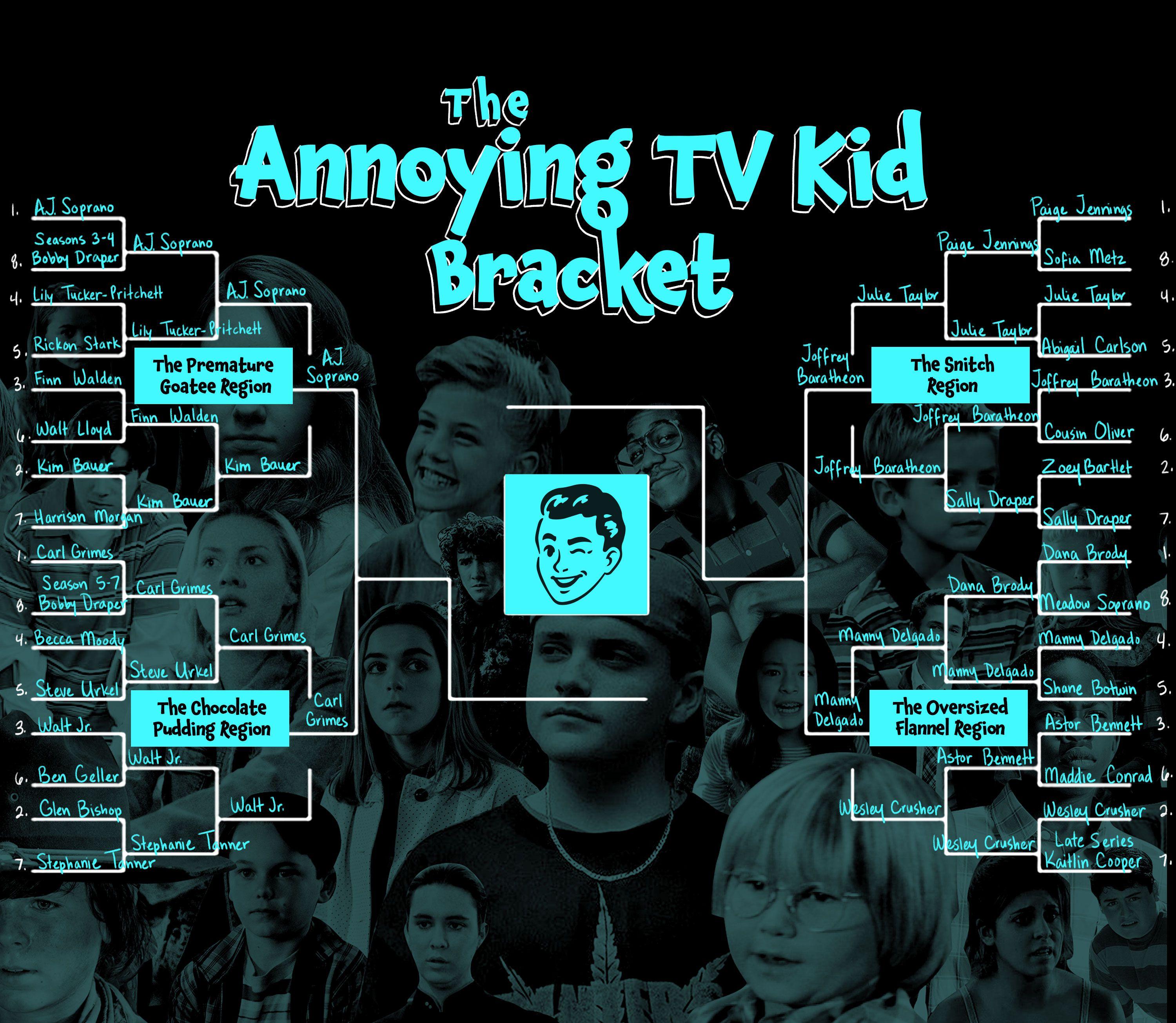 Folks, we’re down to four terrible television children, and they truly are a wretched bunch. In semifinal number one: The Sopranos’ A.J. Soprano versus Coral—sorry, Carl Grimes of The Walking Dead. And in semifinal number two: Joffrey Baratheon of Game of Thrones versus Modern Family’s Manny Delgado.