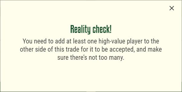 Click “Validate Trade,” and the site essentially tells you to get a grip and stop wasting its time with what sounds like the deluded dream of a biased fan from a team message board.
