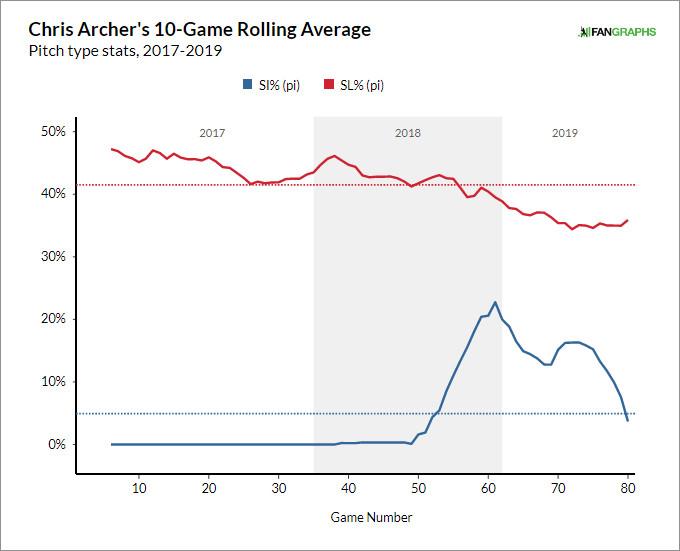 In Pittsburgh, Archer went away from his strengths, throwing more sinkers and fewer sliders in an apparent attempt to conform to the plan espoused by pitching coach Ray Searage: copious sinkers, ample pitching inside, and regular ground balls. Earlier this month, Archer told the Post-Gazette’s Jason Mackey, “I can’t forget the type of pitcher I am. I’m not a contact, ground ball pitcher,” adding, “I probably tried to change too much.”