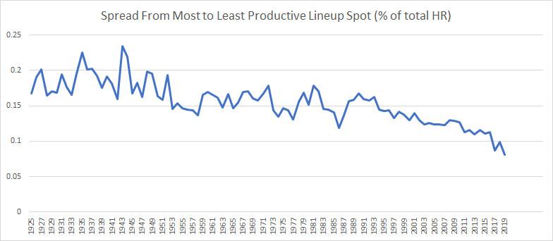 The batting order position that produces the least home runs is usually the ninth spot, which is quite intuitive. But whatever the position, measuring the difference between the most and least homer-heavy spots in the lineup is a good indication of how evenly leaguewide power is spread through the batting order.