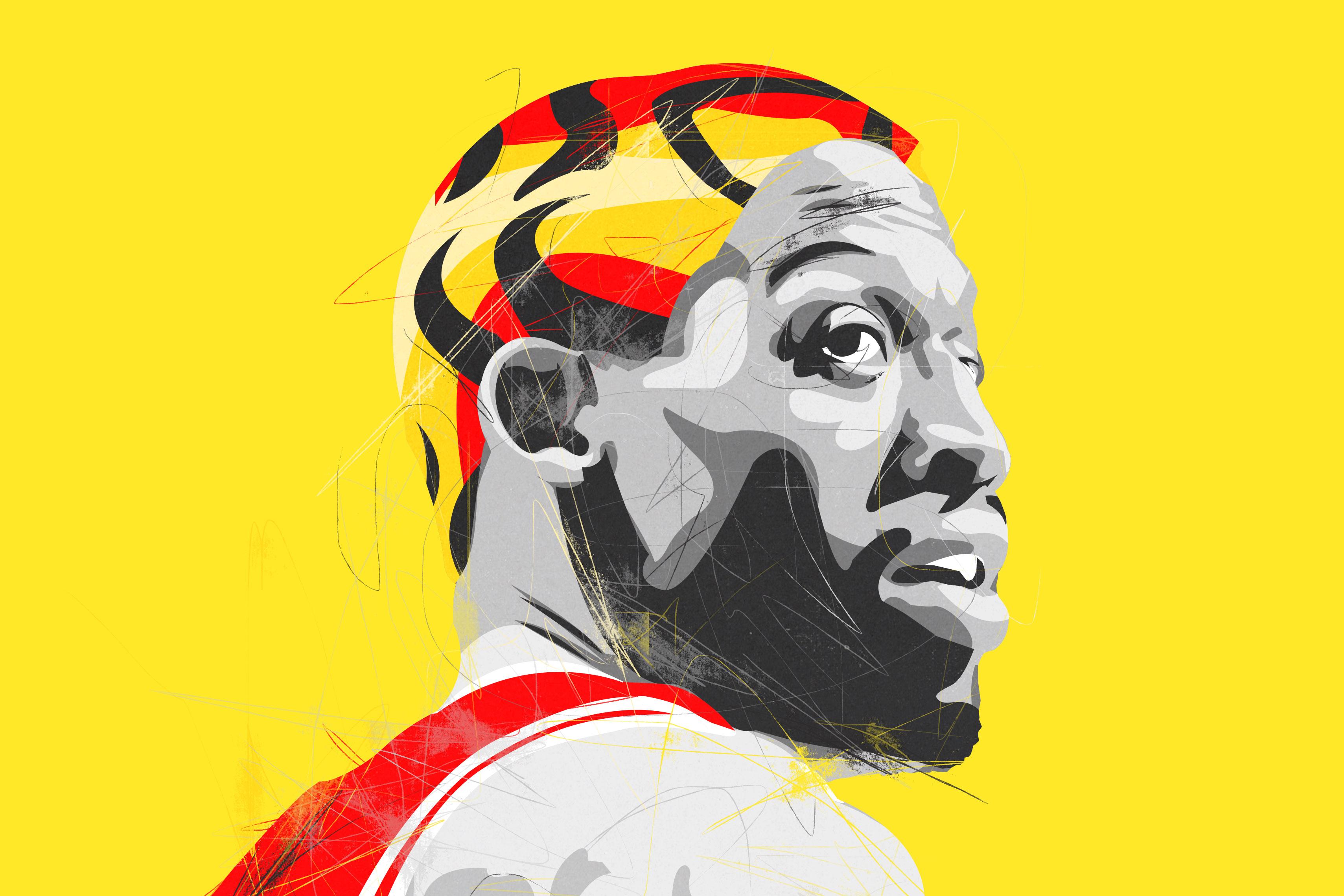 To me, a missed basketball shot looks like haha, whoops, boing. To Rodman, a missed shot presented itself as a comprehensible set of information: the speed, angle, and spin of the ball, the point of contact on the rim or the backboard, the tendencies of the shooter. He had an elite baseball pitcher’s understanding of the aerodynamics of a ball in flight, only instead of throwing the pitch, his job was to materialize at the end of it. And in reversing that process, he reversed the whole emotional dynamic of the game. He made it seem kind of gloriously selfish not to score points. (On a team led by Michael Jordan!) Playing maybe the most archetypally humble, utility-mode role in the history of basketball, Rodman looked as if he were starring in an opera no one else could hear. What he was doing made no sense, but everyone who watched him immediately understood what he was doing. In sports, that’s a kind of greatness.