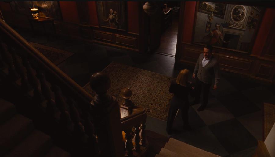 Which leads to the only respite from the dinner table we’re given, as a damaged Tom and Shiv excuse themselves—to Nan’s amusement—under the guise of concern over their sick dog Mondale. (Shiv claims the pooch has a virus. Tom says it has arthritis.) The camera, which is perched high on the house’s steep staircase, catches an in-crisis Shiv and Tom circling each other.