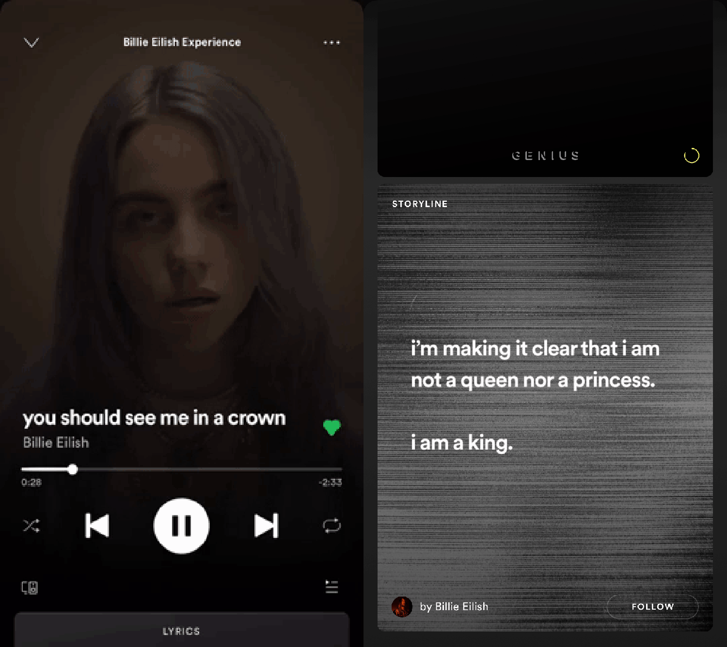 Johnson had stumbled upon a new genre of programming within the Spotify ecosystem: vertical music videos. Ahead of Eilish’s debut album, WHEN WE ALL FALL ASLEEP, WHERE DO WE GO?, the singer worked with the streaming platform to film a handful of smartphone-friendly visuals for breakout singles. The videos can be played in full on something called the “Billie Eilish Experience” playlist, but they have also been edited down to eight-second loops that pop up on users’ screens anytime they play a track on their smartphone. (Most notable among them is the edit for “you should see me in a crown,” a clip in which a tarantula crawls out of Eilish’s open mouth as she makes unblinking eye contact with the camera.) Other non-singles from the album feature animated fan art that depict Eilish as an anime character or a demon. Some even come with “Storylines”—text cards on which Eilish herself explains her music. (“this song is explaining that the ‘guy’ doesn’t always have to be the ‘bad guy,’” Billie wrote about the album’s breakout single in her signature lowercase. “in this case it’s me.”) Johnson began streaming music from her iPhone XS Max and leaving the screen on so that clips of Billie played in the background all day. “Now, it’s like it’s everywhere,” Johnson said. “My battery dies so much quicker now because it’s just playing videos all day long.”