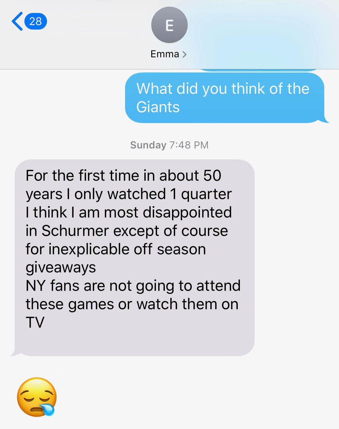 The one way Jones differs from Manning is that when Manning took over for Kurt Warner in Week 11 of 2004, he inherited a talented team. Jones will not. The Giants are 0-2, tied for the second-worst point differential through two games, and have a defense that has been cooked more this season than the Tennessee Titans’ field. The most depressing thing I have read about this Giants season is a text conversation with my 91-year-old grandmother, the matriarch of my family’s sports obsession and the reason I am typing this today.