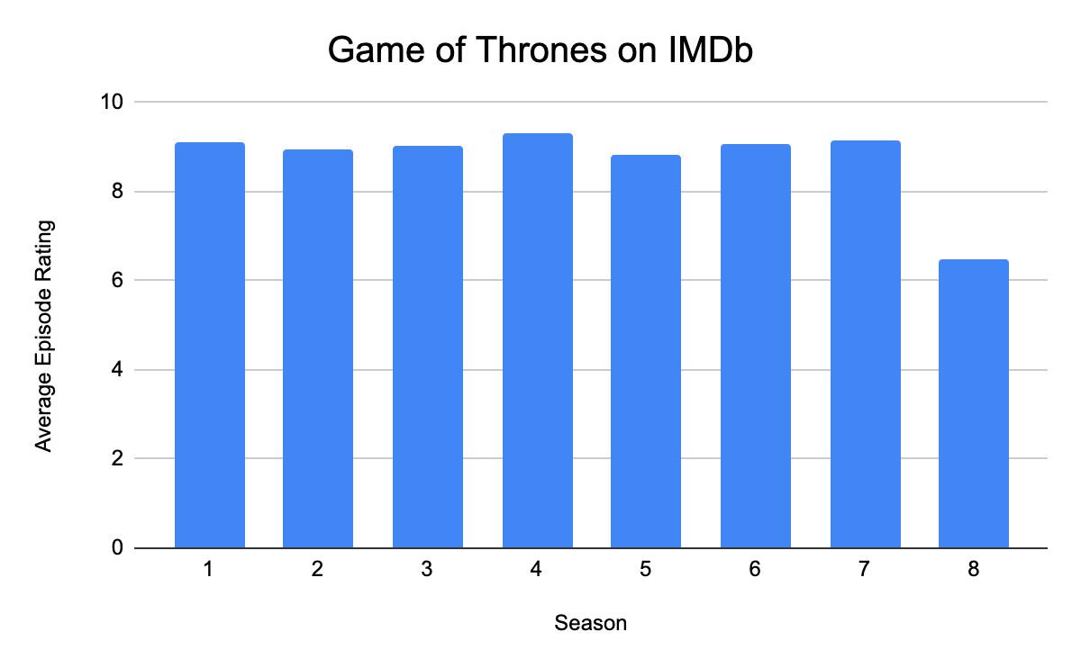 At IMDb, where thousands of reviewers have rated every episode on a scale from 1 to 10, Season 8 clearly comes out the worst on average. Even if some of that distortion is the result of targeted backlash from disgruntled fans, those reviewers aren’t alone; at The Ringer, we ranked both “The Iron Throne” and “The Last of the Starks” among the 10 worst episodes in the show’s history, and placed “The Bells” in the bottom half. The entire back half of Season 8, in other words, was subpar by Thrones standards.