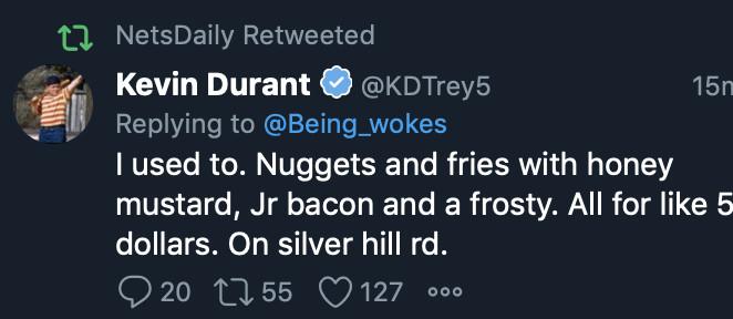 But when it turns into Durant fact-checking people online, or discussing his Wendy’s order, it’s delightful: