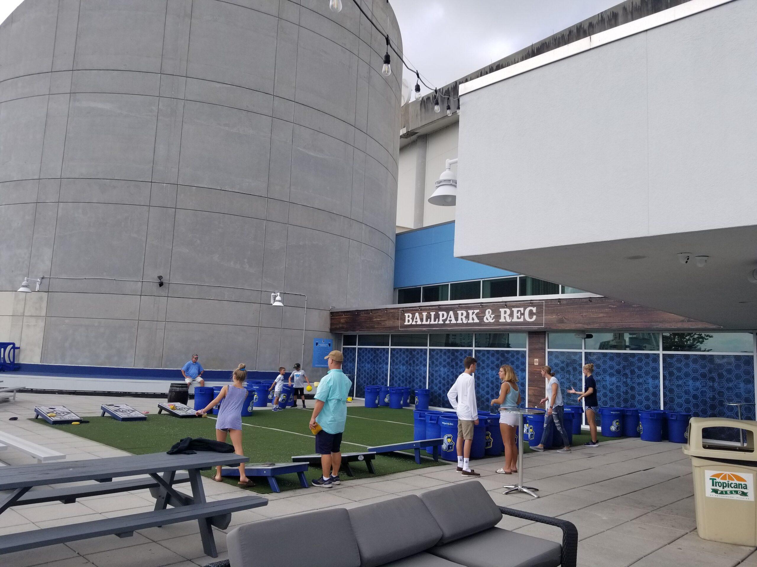 The Rays’ heavy promotional schedule and Tropicana Field’s uninviting exterior might lead one to believe that the Rays play in a dank, mausoleum-like park, but there’s a lot to like about the stadium experience. With the reduced seating capacity, most seats at the Trop are now in the lower deck, which after the 2014 renovation rings the entire stadium. While most outdoor parks, even new ones, have weatherbeaten and austere concrete concourses, Tropicana Field’s concrete floors are painted an inviting shade of blue, and a section of the outfield concourse is overlaid in wood laminate. Out in center field, past the ray tank, is Ballpark & Rec, an indoor-outdoor bar with pregame drink specials and an outdoor terrace with lawn games, from cornhole to jumbo-sized Jenga.