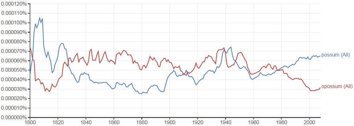 One might think that the shorter, snappier word would have caught on quickly and driven opossum extinct. Yet as Google’s Ngram Viewer—a search engine that charts the frequencies of certain words or phrases in printed sources between 1500 and 2008—reveals, the two fought for supremacy for hundreds of years, and opossum had the upper hand for decades at a time. Even 19th-century nativists’ anti-Irish sentiments couldn’t curb its use.