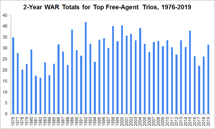 Even if Martinez were to opt out, Strasburg would be the more appealing player. If we count him as the third-best free agent, then this winter’s top trio amassed 31.6 WAR over the past two seasons. Here’s how that stacks up against top free-agent trios of the past, going back to the beginning of free agency in 1976: