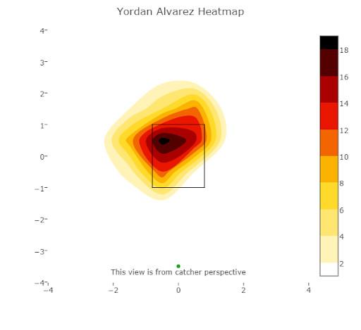 The explanation probably isn’t that he can’t catch up to good heat—or, at least, it wouldn’t be, unless fatigue is sapping his bat speed. If there is a game plan that the Rays and Yankees followed—and that Daniel Hudson employed to great effect in World Series Game 1—it was staying away from the places where he pulls pitches in the air, which is how he does much of his damage. Here’s where fastballs to Álvarez produced the most valuable pulled balls in the air during the regular season: low and in.