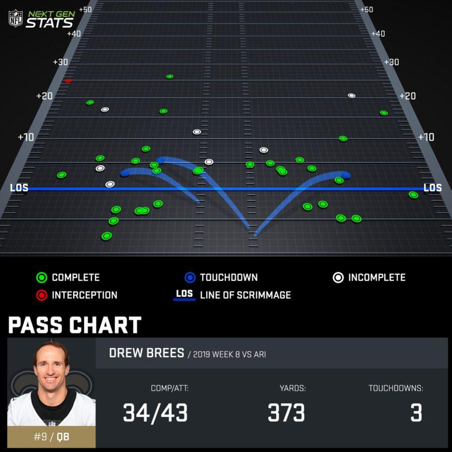 Brees’s completion percentage has steadily risen in each of the last three seasons, not including 2019. That is in part because Brees has quietly become one of the least aggressive passers in football. Per Pro Football Focus, Brees has gone deep (more than 20 yards downfield) on just 5.5 percent of his throws this season, which is the lowest mark of any quarterback who has attempted at least 75 passes. Brees’s average depth of target this season, per Pro-Football-Reference, is 6.3 yards, which would be the second-lowest mark of any QB this season if Brees qualified for that leaderboard. His passing chart from Week 8 does a good job of illustrating just how many of his throws are coming on simple dump offs near or behind the line of scrimmage: