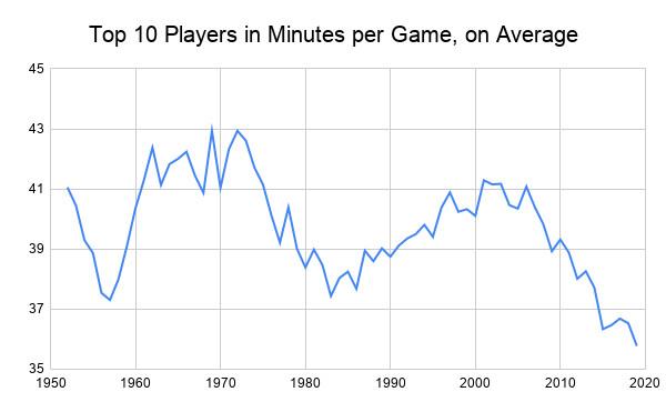 Teams have also generally lessened the minutes load their best players are required to shoulder. Some stars are missing entire games for load management, while others are simply playing fewer minutes. The top 10 players in minutes per game last season averaged only 35.8 minutes, the lowest on record, and the five lowest such averages in league history come from the past five seasons.