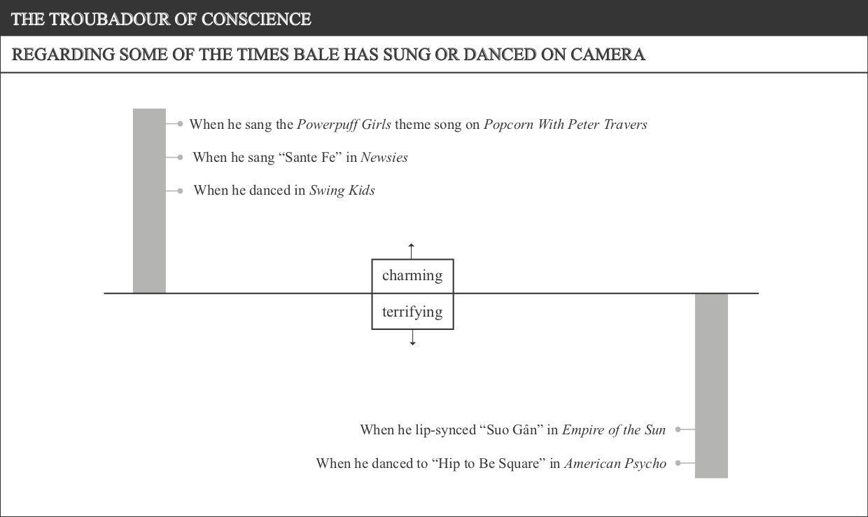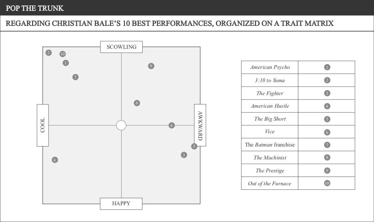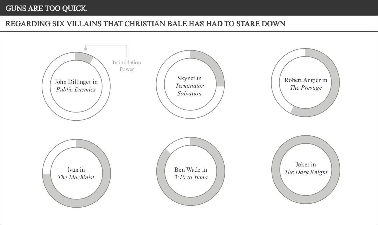 Bale has a new movie coming out this week. It’s called Ford v Ferrari. And, Bale being one of the most talented working actors on the planet, I am very excited for it. So much so, in fact, that I spent the past several days rewatching every movie that Bale played a major role in over the past two or so decades—even Terminator Salvation, which is how you know I took this seriously. As such, below are some charts. They’re all about Bale, about some aspect of his movie existence, be it a movie-specific thing or a general career thing. Some of the charts have accompanying text underneath them. Others do not. That’s what this article is.