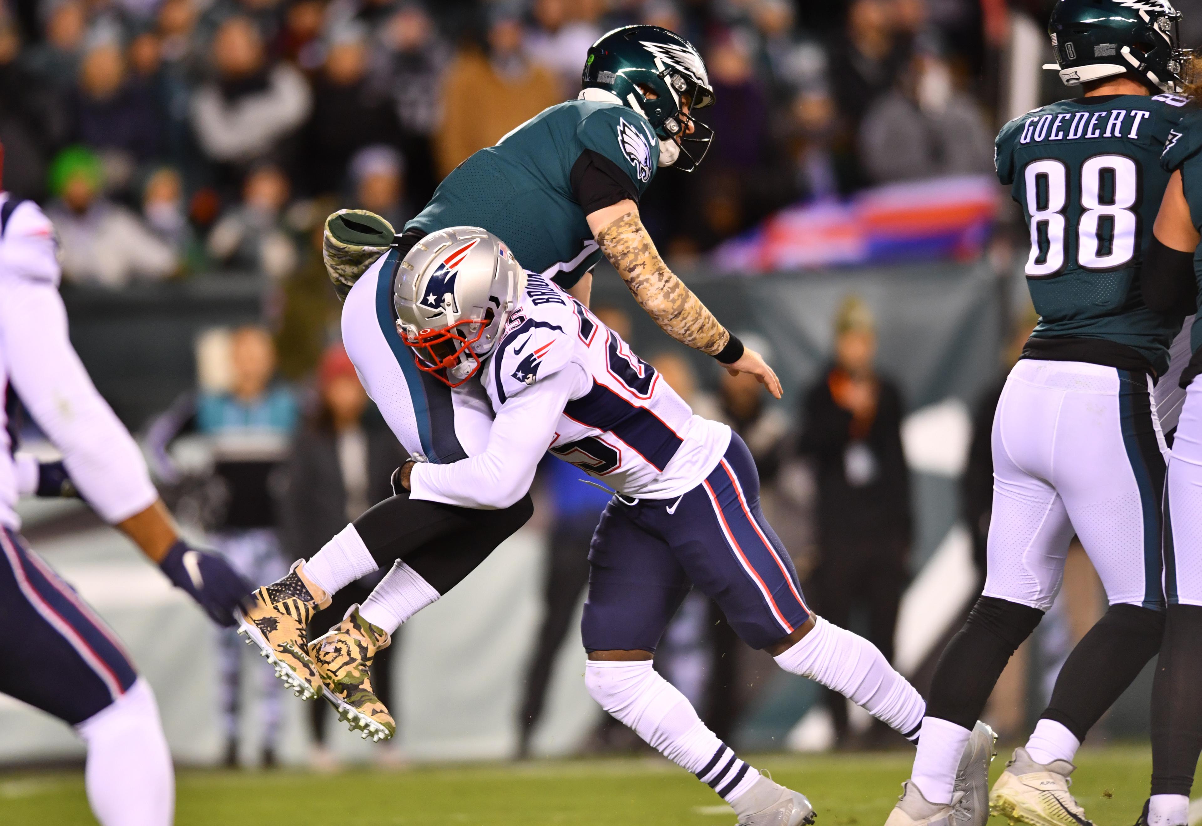 Wentz completed 20 of his 40 pass attempts for 214 yards (5.4 yards per pass), one touchdown, and no interceptions. He was sacked five times on Sunday, with all coming after right tackle Lane Johnson left to be evaluated for a head injury. The Eagles struggled without Johnson: After scoring a touchdown to go up 10-0 early in the second quarter, the Eagles gained a total of 21 yards on their next six drives combined and did not score the rest of the game. After six consecutive punts, Wentz’s big opportunity came at the end of the game. With the Patriots up 17-10, New England pinned the Eagles 94 yards from the end zone with just over four minutes to play. Wentz quickly completed three first downs to get the Eagles to the New England 45-yard line at the two-minute warning. The break seemed to give the Patriots defense time to game plan how it wanted to attack the Eagles, but that plan worked only because Wentz missed some crucial throws at the end. Those misses overshadowed a drive that had more yardage (68) than Philly’s previous five series. Wentz skipped a pass to an open Nelson Agholor; overthrew open tight end Zach Ertz, who beat cornerback Stephon Gilmore in coverage; and set up a fourth-and-10 with the game essentially on the line. On their last real play (not counting a three-play drive that ended with a failed Hail Mary to end the game), Wentz put the ball in Agholor’s hands in the end zone for a difficult catch that Agholor dropped.