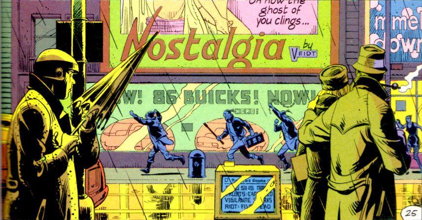 Cynthia’s workplace is significant because Nostalgia was previously owned by Veidt as well; the cosmetics brand’s ads appear throughout Moore and Gibbons’s novel: