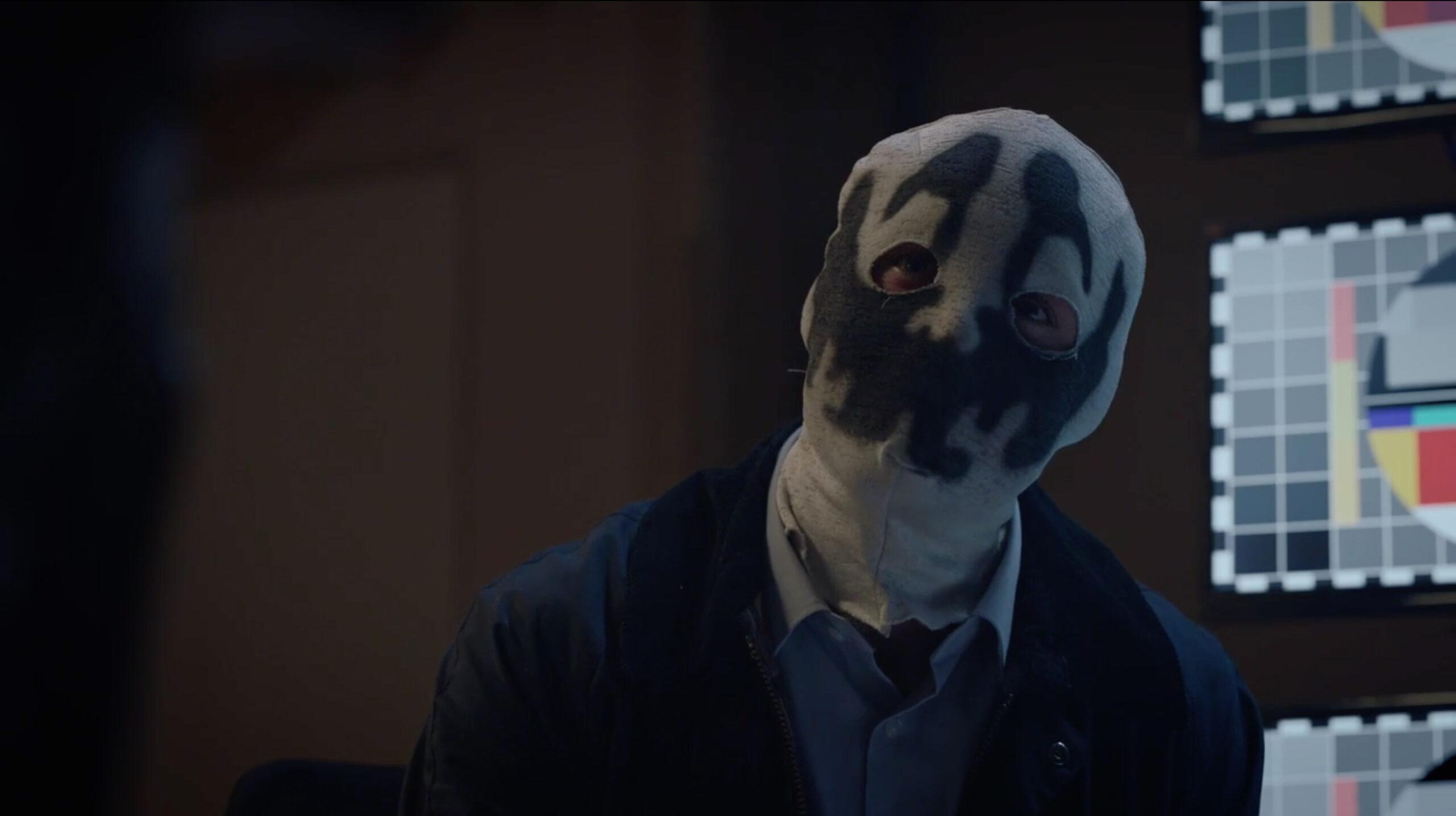 The senator is still wearing his Rorschach mask as he sits down next to Wade in the room they’ve dragged him to—one that has a wall of TV monitors—but Wade immediately picks up on the unmistakable twang in his voice. “Shit … am I still wearing my mask?” Keene says, as he begins rolling the mask off his face. “Sorry. That is just incredibly rude. This is just for them.”