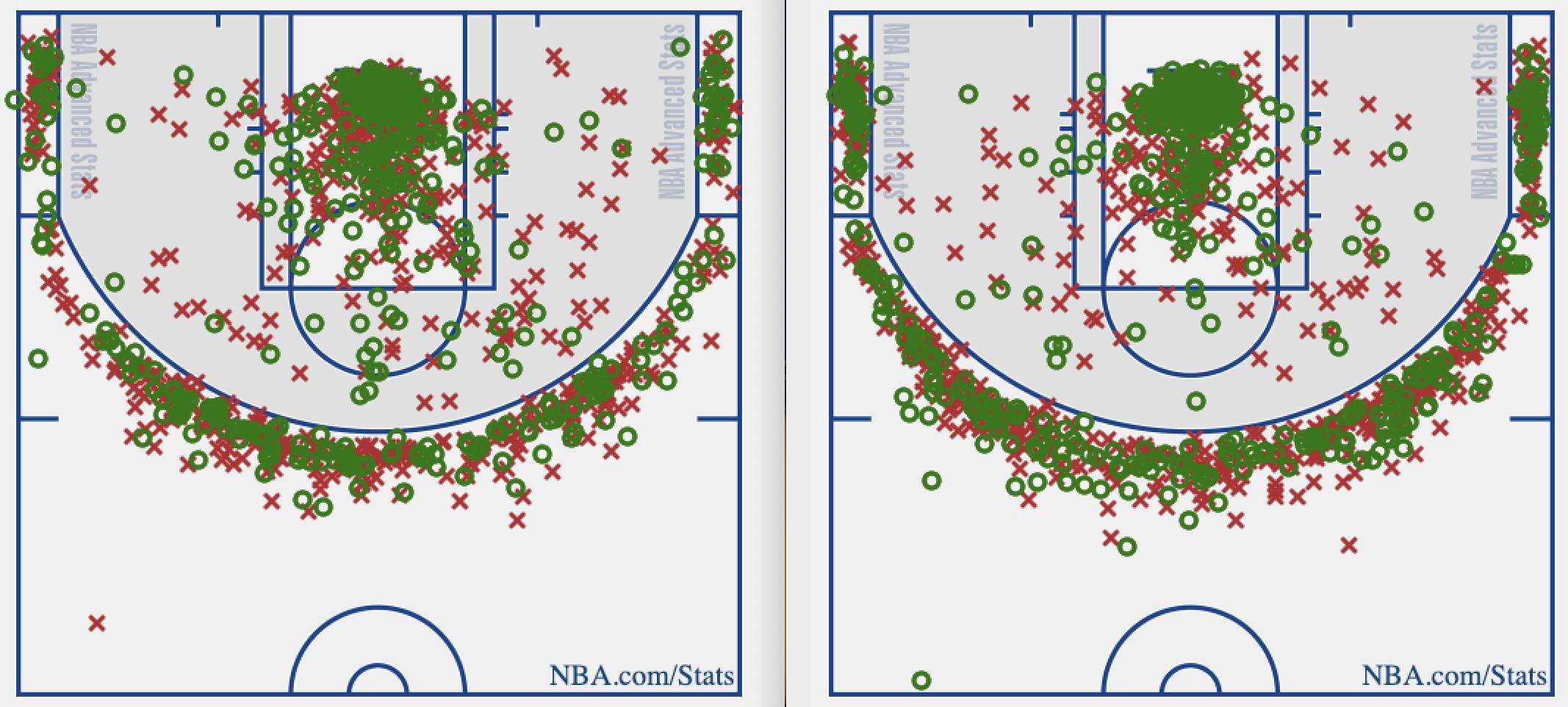 Let’s start with Chicago, home to the league’s worst offense—a surprise given the talent on hand, from Zach LaVine to Lauri Markkanen to a supporting cast brimming with capable scorers. The Bulls also run a modern offensive system, with four shooters on the floor and a focus on high-efficiency areas. Here’s a quick game: Which of these shot charts belongs to Chicago, and which belongs to Houston, the team most committed to an analytics-friendly offense?