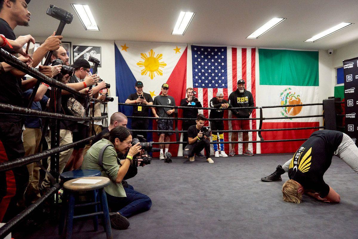A thicket of reporters and vloggers filtered into the cramped room outfitted with a ring, punching bags, and plenty of Paquiao paraphernalia. Wristbands were rationed out to differentiate who we were: red for media, yellow for Paul’s team. The latter filled the room: Paul’s publicists set up camp on the edge of the wall opposite the ring with their phones out, his manager and camera crew lingered at the ropes, and a lone makeup artist who they’d hired for the day hovered with a blotting paper and a foundation sponge.
