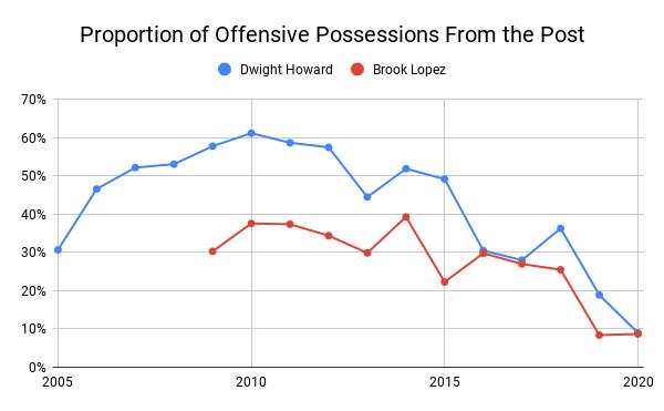 The game’s evolution is clearly visible through the lens of two All-Star big men who have entered new stages of their careers. The first is Howard, who used more than half of his possessions from the post for more than a decade as an offensive focal point. The other is Brook Lopez, whose post percentage typically hovered in the 30s in his Nets heyday. Now, though, both players use less than 10 percent of their possessions that way.